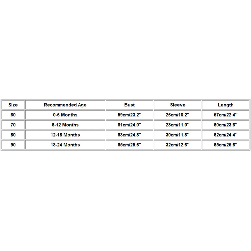 Размер Рекомендуемый возраст Обхват груди Рукава Длина 60 Для детей от 0 до 6 месяцев 59 см/23,2'' 26 см/10,2" 57 см/22,4'' 70 6-12 месяцев 61 см/24,0" 28 см/11,0'' 60 см/23,6" 80 12-18 месяцев 63 см/24,8" 30 см/11,8'' 62 см/24,4'' 90 18-24 месяцев 65 см/25,6" 32 см/12,6'' 65 см/25,6"
