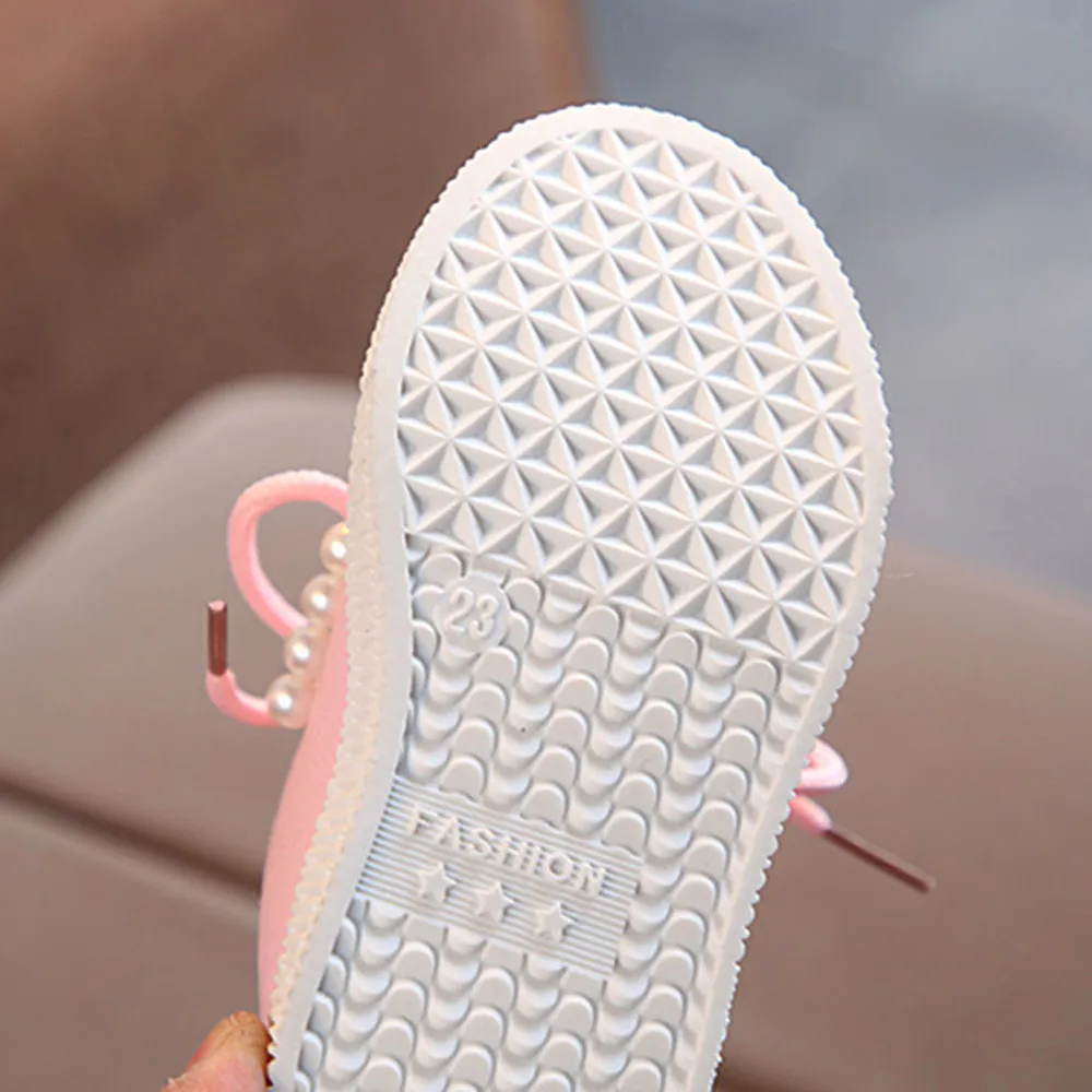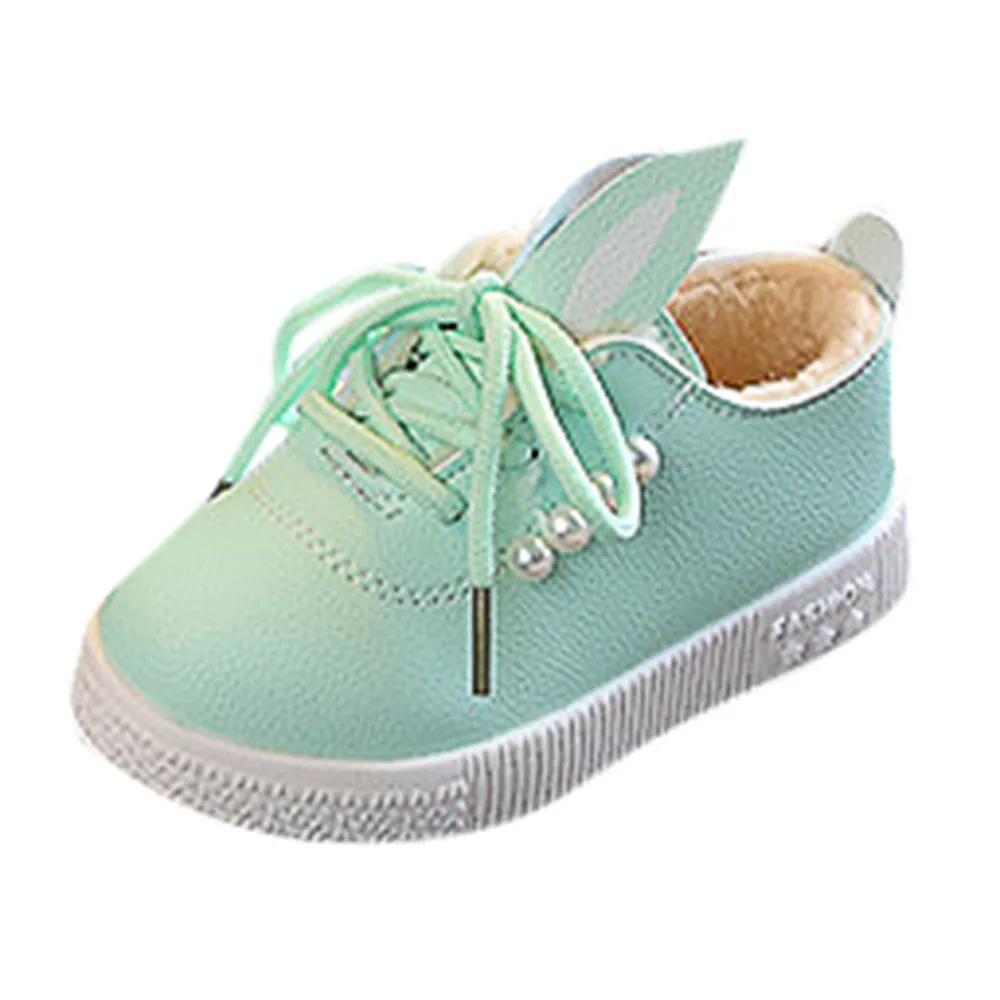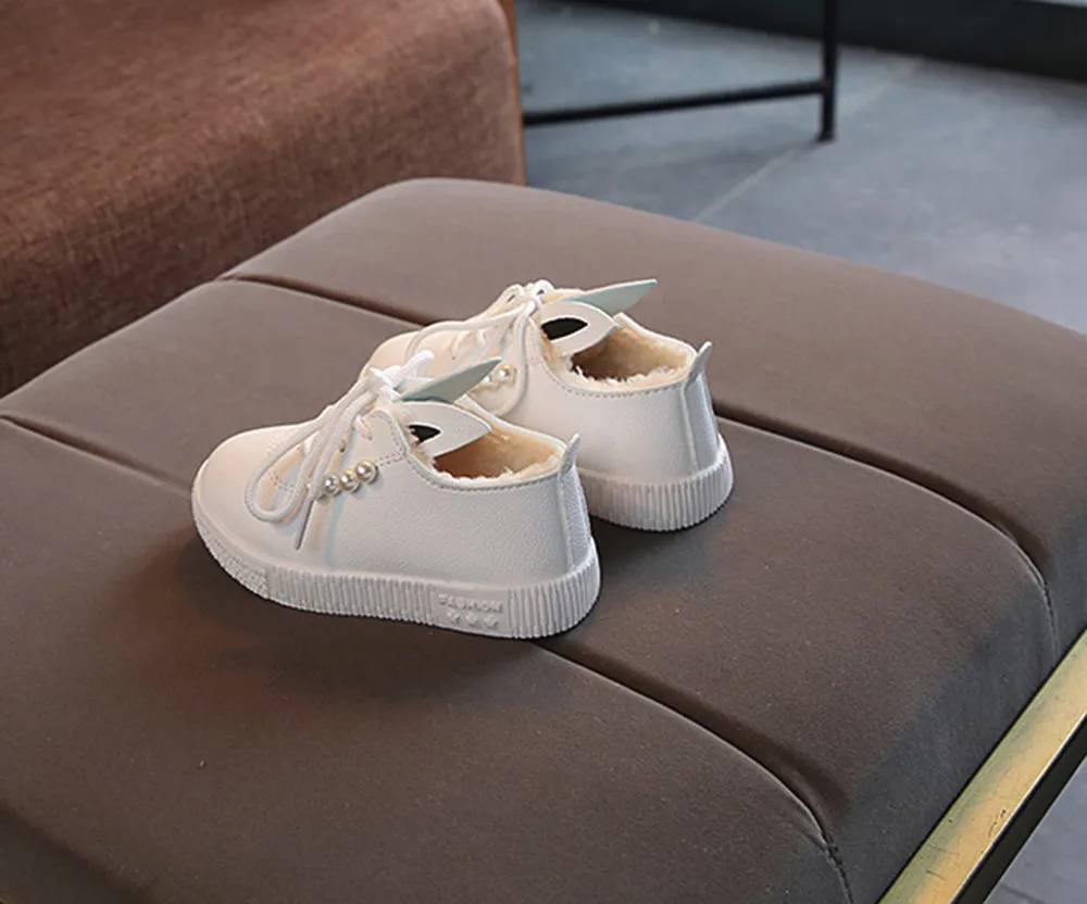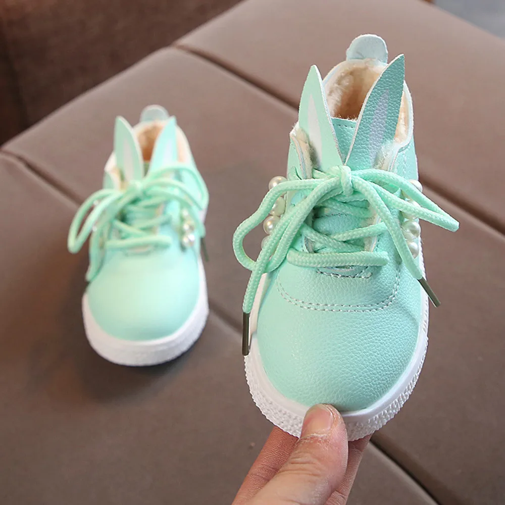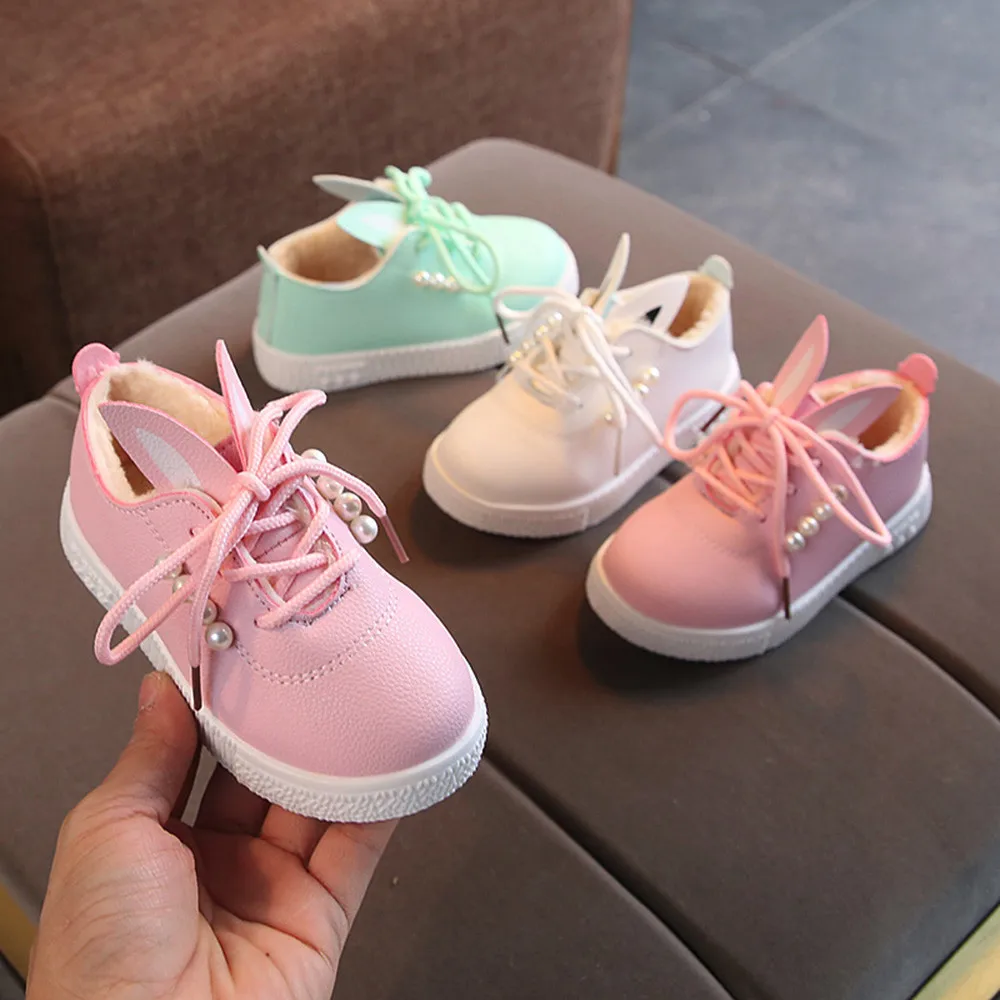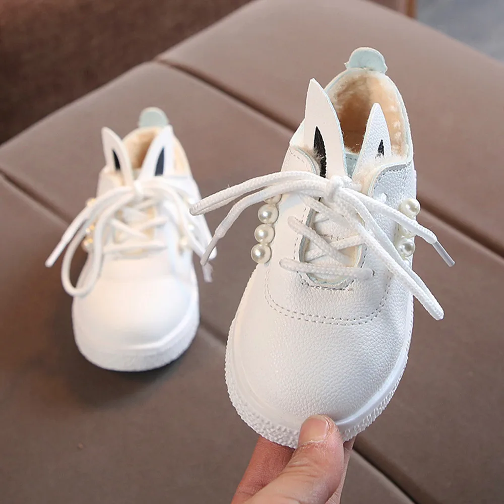 Детские кроссовки с жемчужными ушками для маленьких девочек; теплые мягкие Нескользящие тонкие туфли