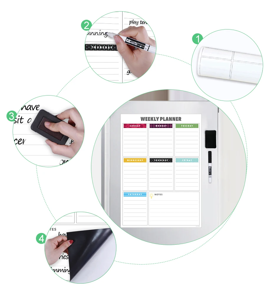 1. Запись школы, встреч, рождественских вечеринок, свиданий или секретных подарков Санты и подарков на праздники. 2. Отлично подходит для офисов, комнат в общежитии и фитнес-целей и делает Потрясающий подарок для планировщика в вашей жизни. 3. Это помогает родителям запоминать их важные встречи и деятельность их ребенка, в то время как это напомнит детям выполнять свои порученные задачи. 4. Холодильник может быть напоминанием, записью списка покупок и еженедельным планом. 5. Дети могут практиковаться в написании, граффити и рисовании.