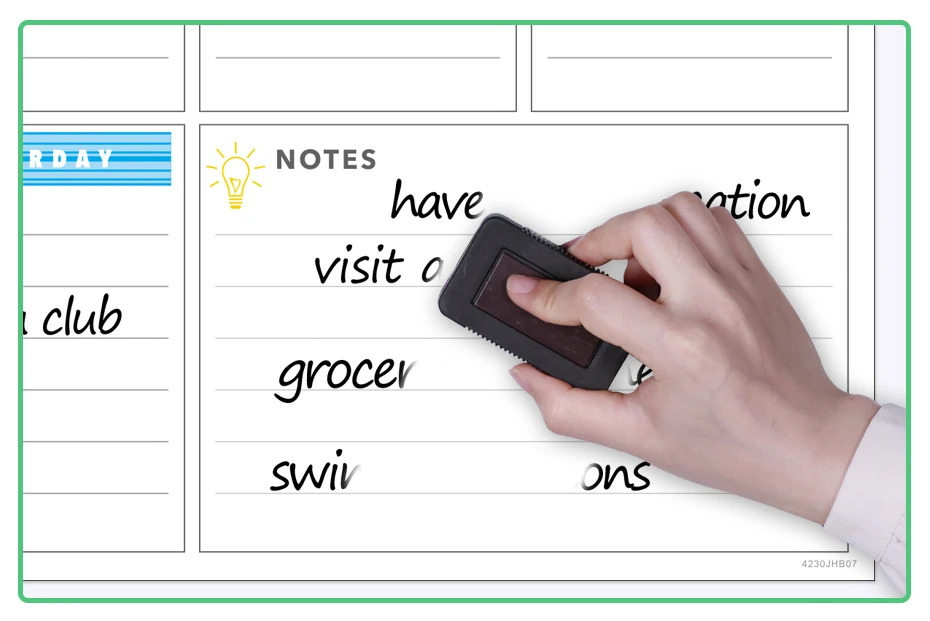 Стираемая поверхность и ручка для белой доски обеспечивают бесконечную удобство использования. Нет необходимости получать другой календарь. Месяц закончился? Все, что вам нужно сделать, это вытереть ваш календарь и начать заново-это так просто!
