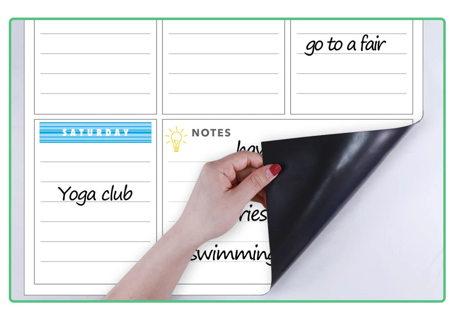 Описание: детские chore chart, магнитное расписание, to-do list Материал: магнитный порошок, резина, HD печать, ПЭТ пленка. Особенности: самомагнитный, гибкий, поддержка письма, портативный, прочный. Размер: 42*30 см Толщина: 0,4 мм Стираемость: сухая стирается, долговечная яркая и легко очищается. Применение: нанесите на поверхность из железа, например, на холодильник и так далее.