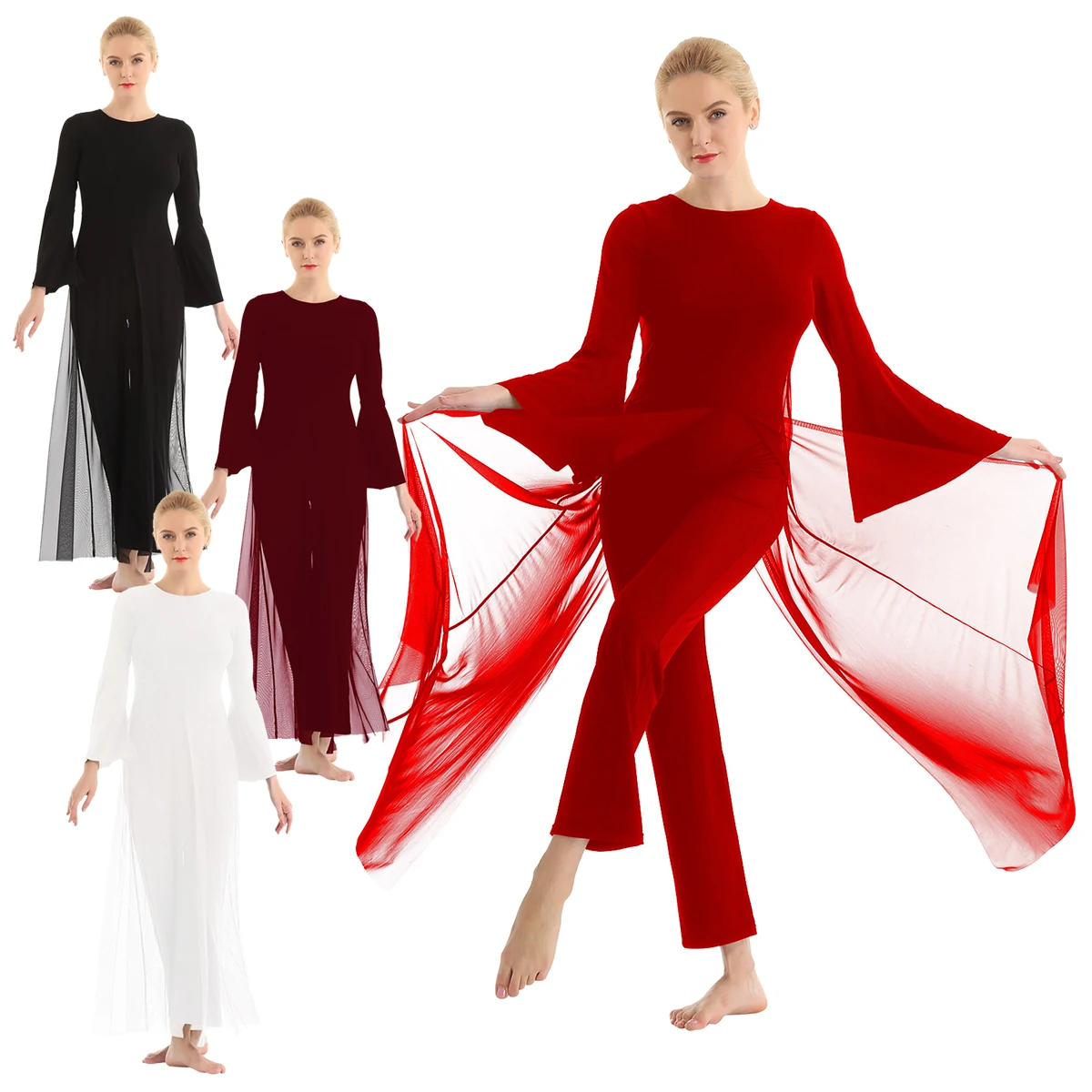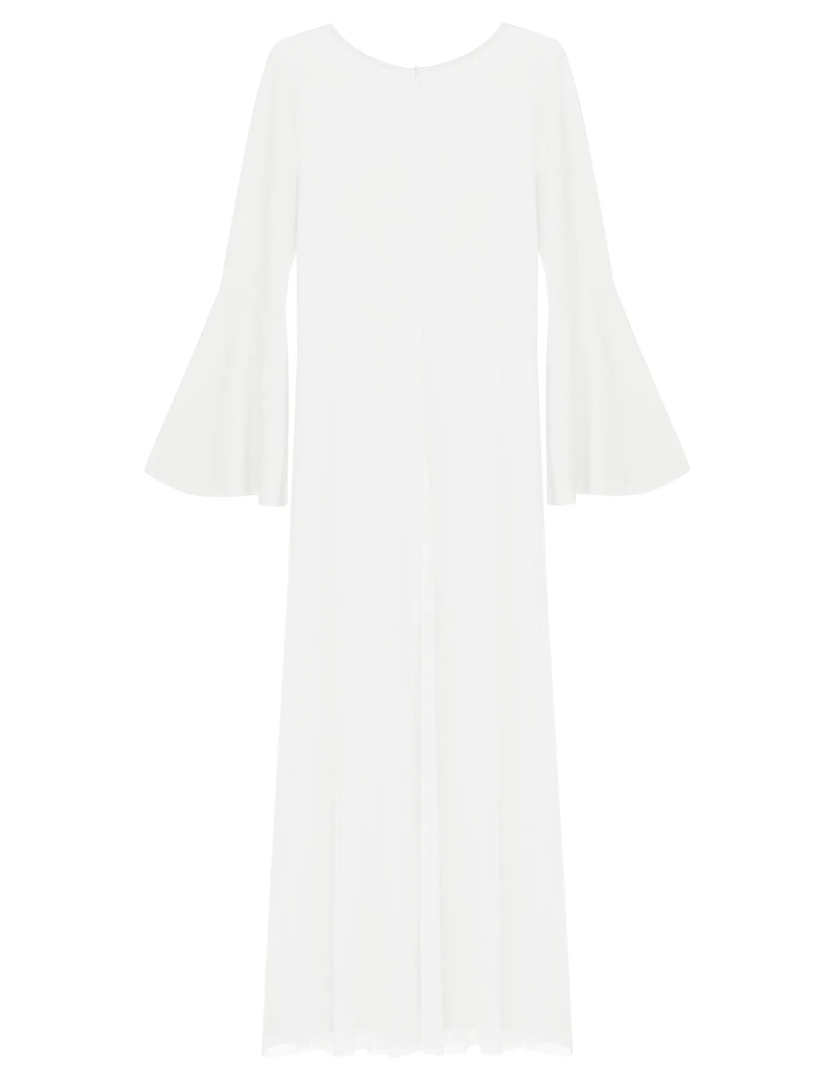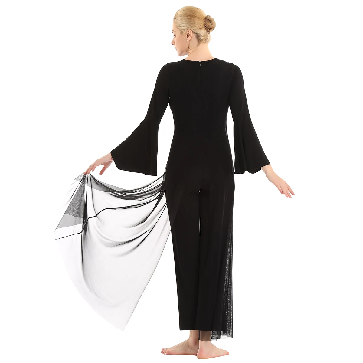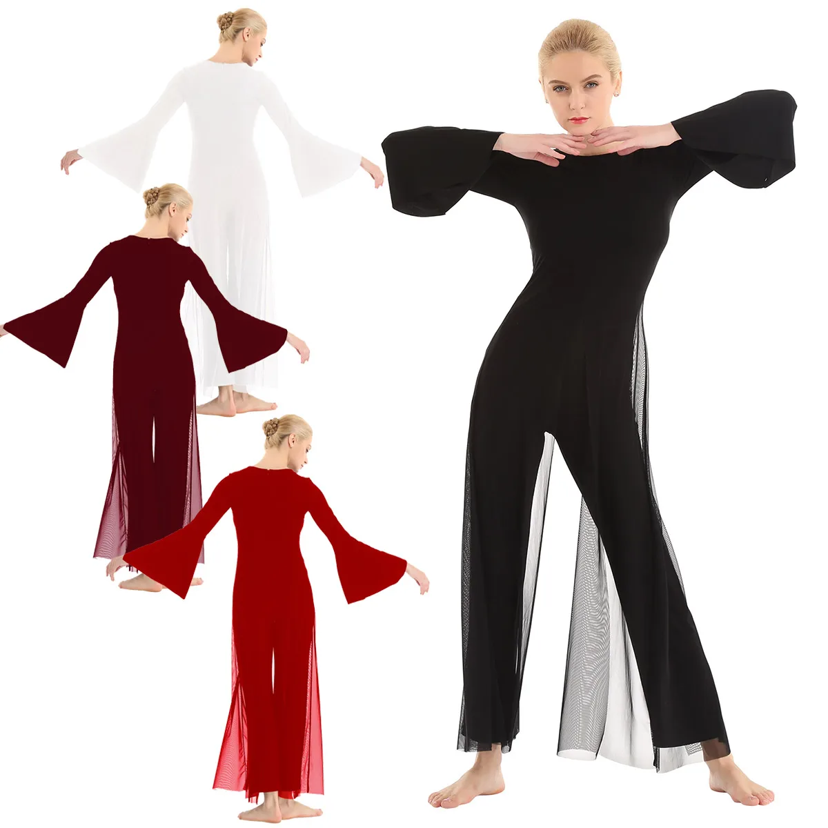 Круглый вырез, длинные расклешенные рукава и широкие ноги, Верхний сетчатый слой накладывает полный комбинезон с разрезом спереди и сзади.
