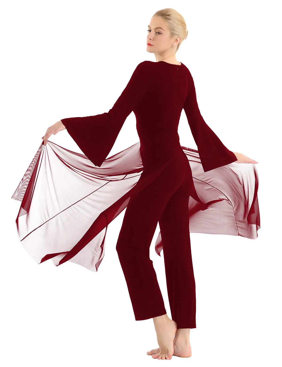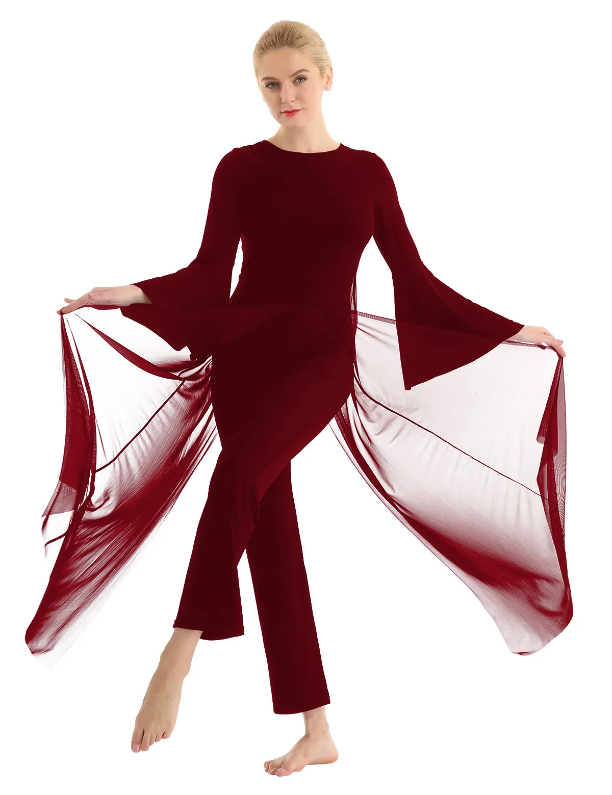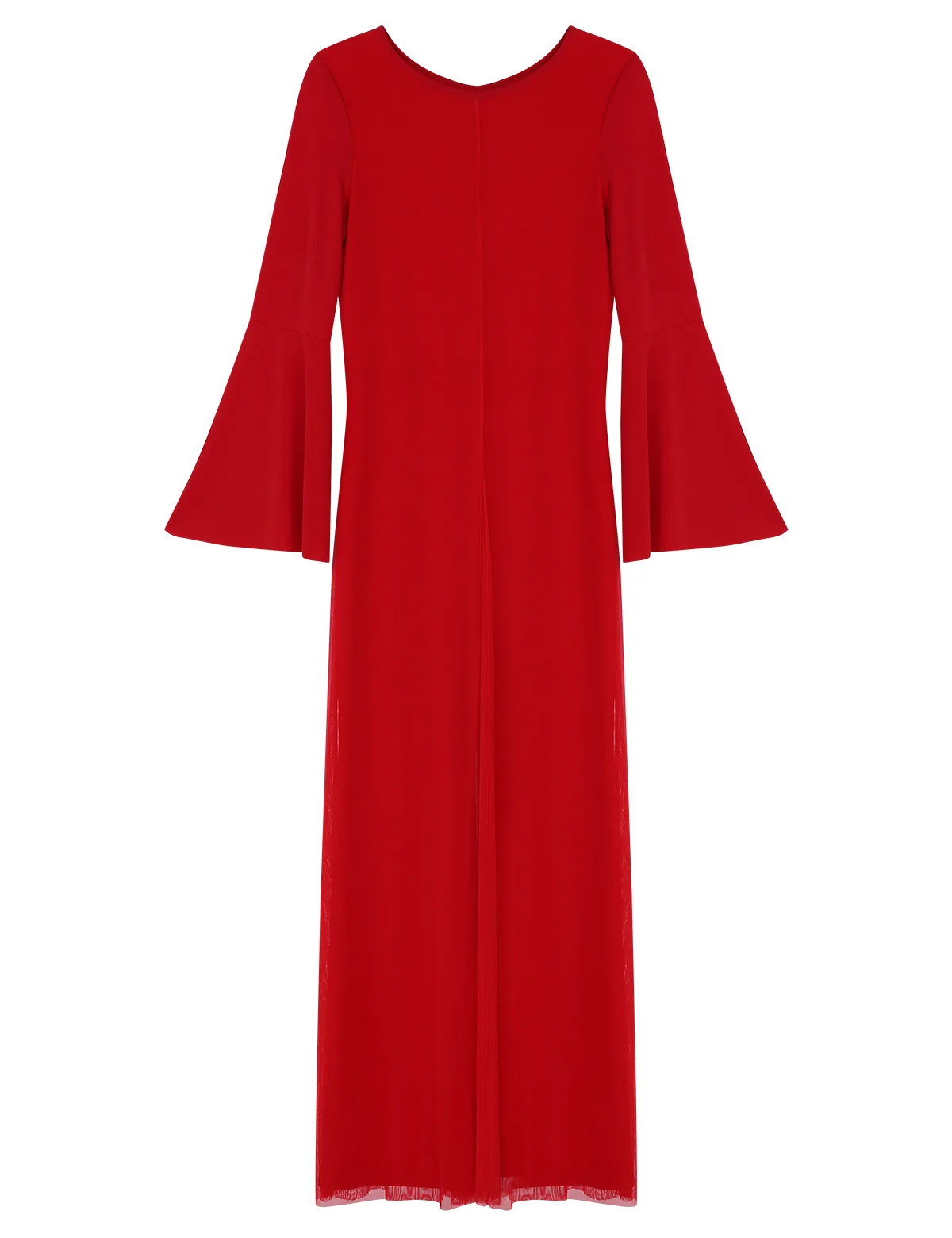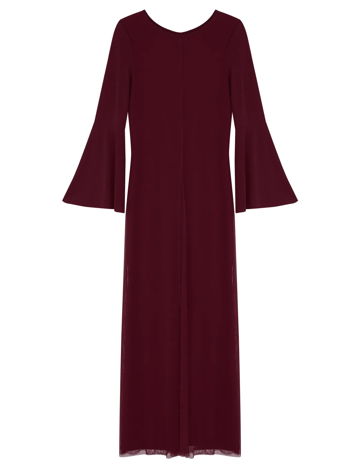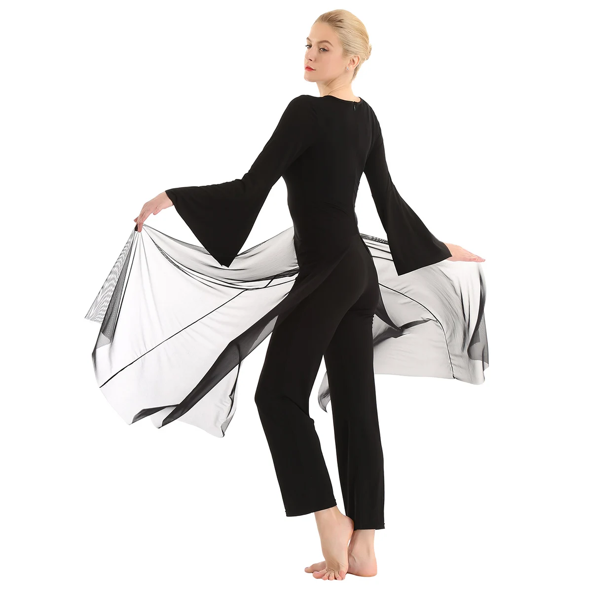 Круглый вырез, длинные расклешенные рукава и широкие ноги, Верхний сетчатый слой накладывает полный комбинезон с разрезом спереди и сзади.
