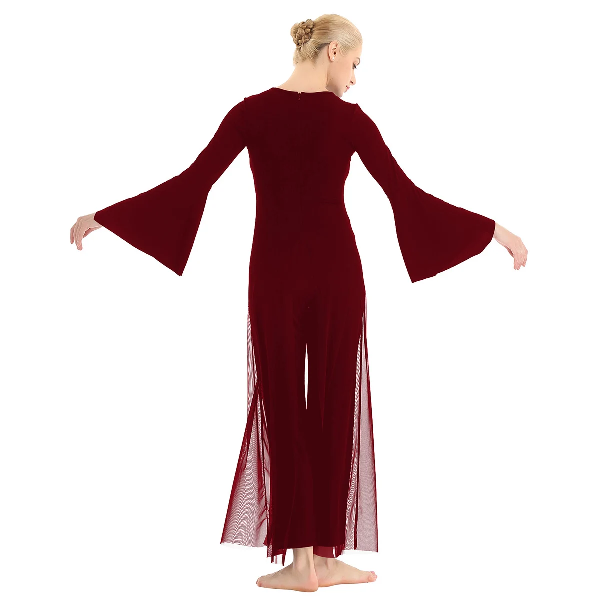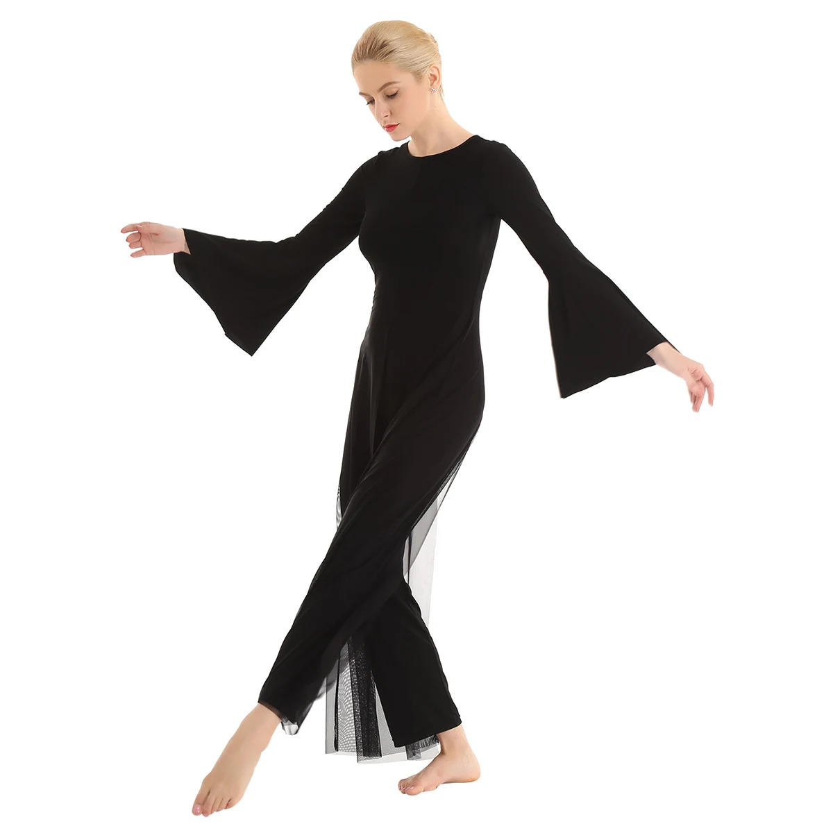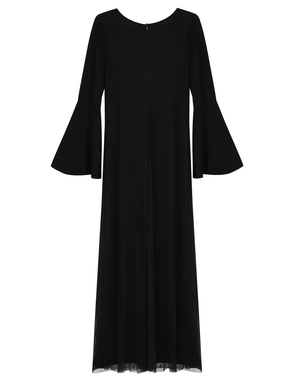 Круглый вырез, длинные расклешенные рукава и широкие ноги, Верхний сетчатый слой, полный комбинезон с разрезом спереди и сзади.