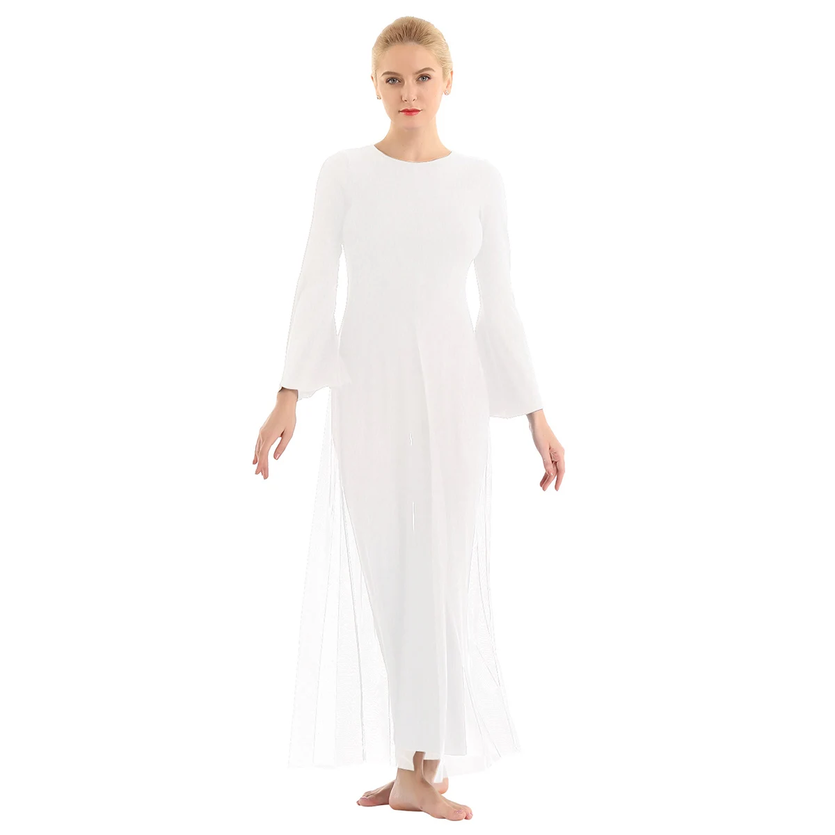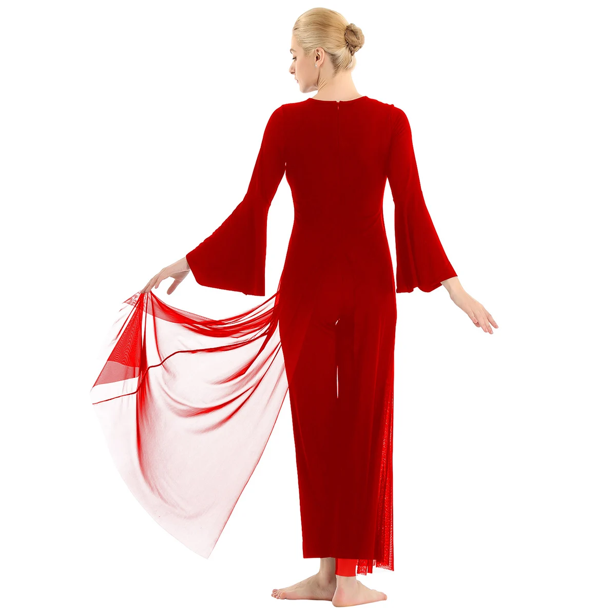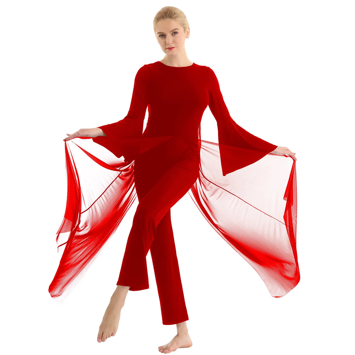 Круглый вырез, длинные расклешенные рукава и широкие ноги, Верхний сетчатый слой, полный комбинезон с разрезом спереди и сзади.
