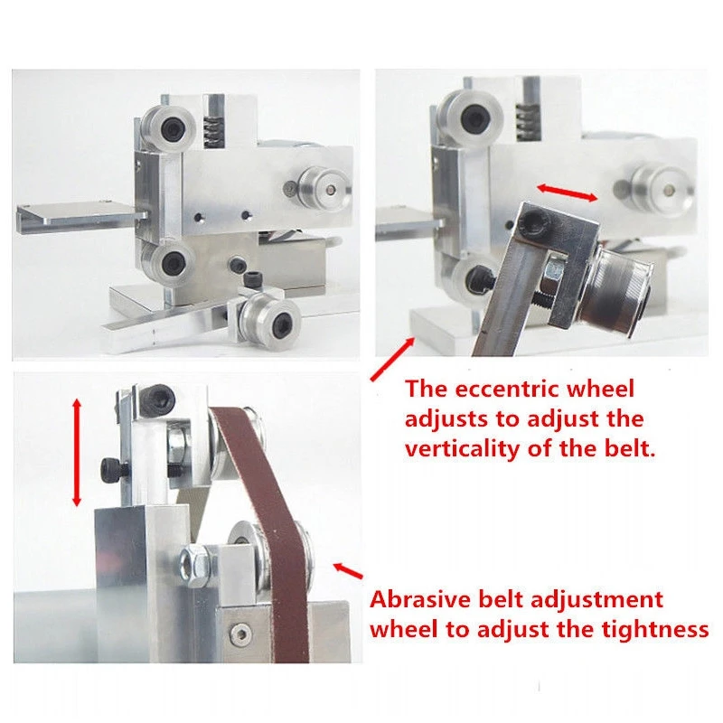 100% абсолютно новый. Встроенный двойной подшипник, противоскользящий дизайн, защита от пыли. Эксцентричное регулирующее колесо для регулировки вертикальности ремня. Абразивный пояс регулирует колесо для регулировки герметичности. Вы можете свободно регулировать угол на рабочей скамье.