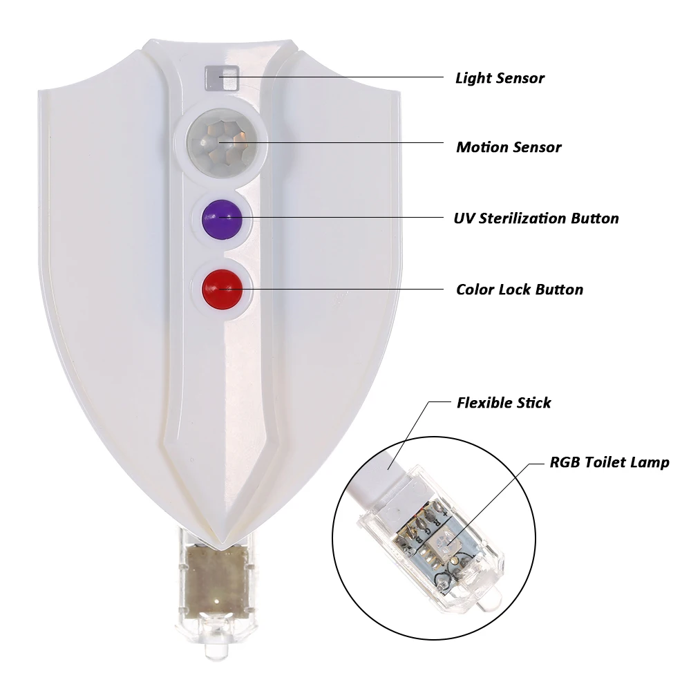 Ваш светильник для ванной, ярко яркий в полночь? Дозируйте лампу для ванной, чтобы беспокоить сон вашей семьи? Эта туалетная лампа-идеальное решение. Он имеет встроенный порт motion & светильник сенсор, что означает, что он будет автоматически светильник, когда люди подход в пределах 2 м в ночное время и автоматически отключается после того, как люди покинули. Он имеет мягкий светильник в 8 цветах, чтобы украсить ванную комнату или в режиме УФ стерилизации, чтобы борьба с бактериями. С этой установленной лампой, ваш туалет будет более удобным и здоровым.