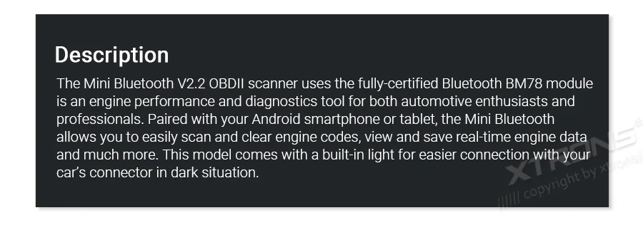 Мини-сканер Bluetooth OBDII-это инструмент производительности двигателя и диагностики для любителей автомобилей и профессионалов. В сочетании со смартфоном или планшетом Android Mini Bluetooth позволяет легко сканировать и очищать коды двигателя, просматривать и сохранять данные о двигателе в реальном времени и многое другое. Эта модель имеет встроенный светильник, который обеспечивает более легкое соединение с разъемом вашего автомобиля в темноте.