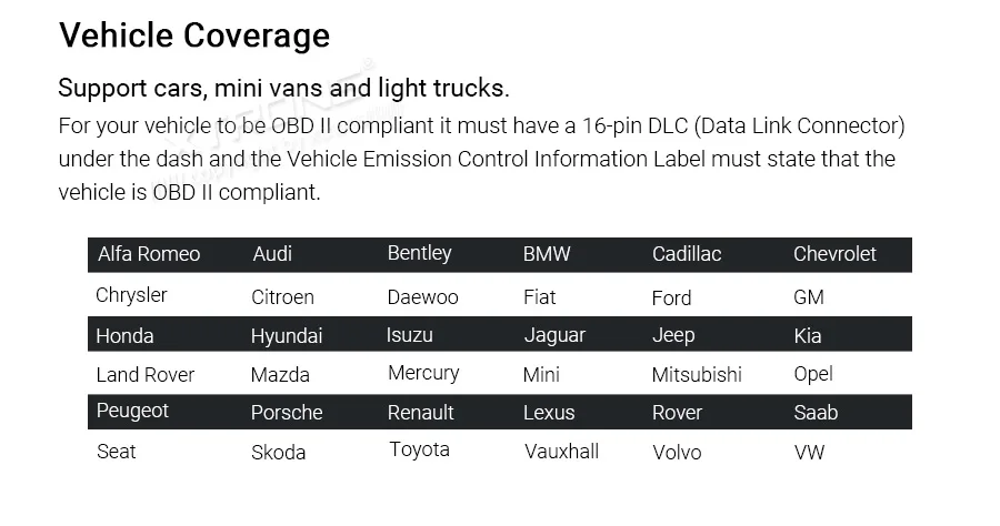 Для вашего автомобиля, который будет соответствовать стандарту OBD II, он Обязательный аксессуар одежды нового сезона 16-контактный диагностический разъём (DLC) под приборной панелью и очистки выхлопных газов, Управление на наклейке «Информация» должно быть указано, что автомобиль соответствует нормам OBD II.