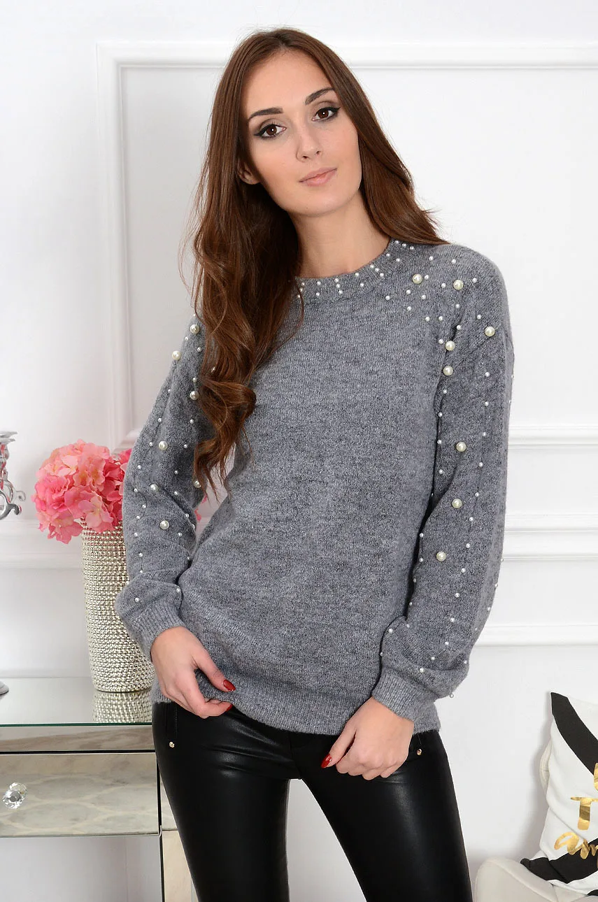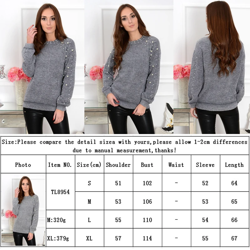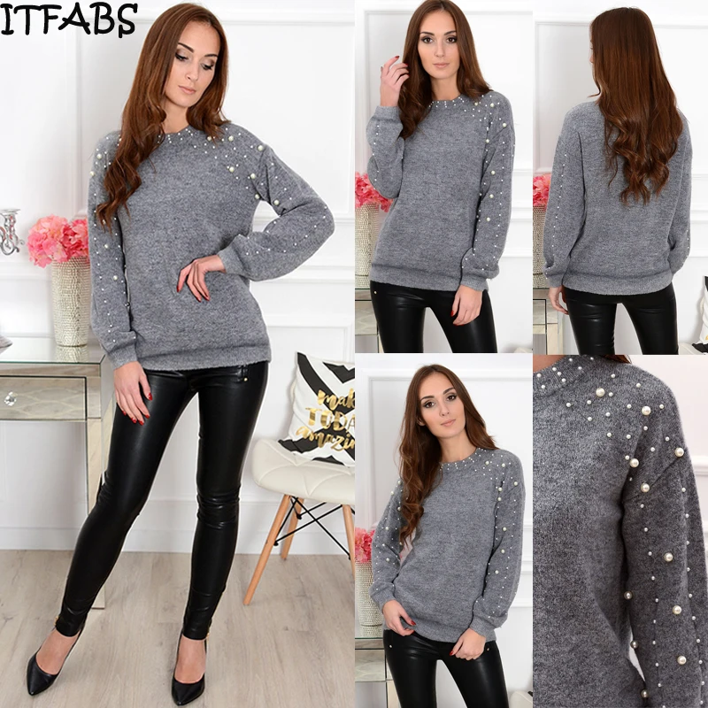 Женский модный однотонный свитер с круглым вырезом и длинными рукавами, украшение в виде жемчужины, теплая блузка
