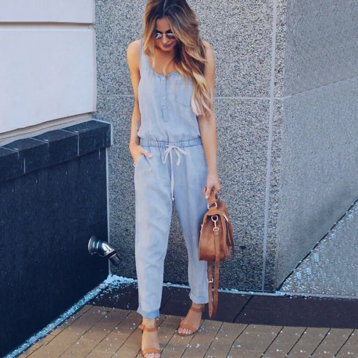 Женский джинсовый комбинезон, комбинезон, свободный, без рукавов, с эластичной резинкой на талии, для лета, для пляжа, JS26