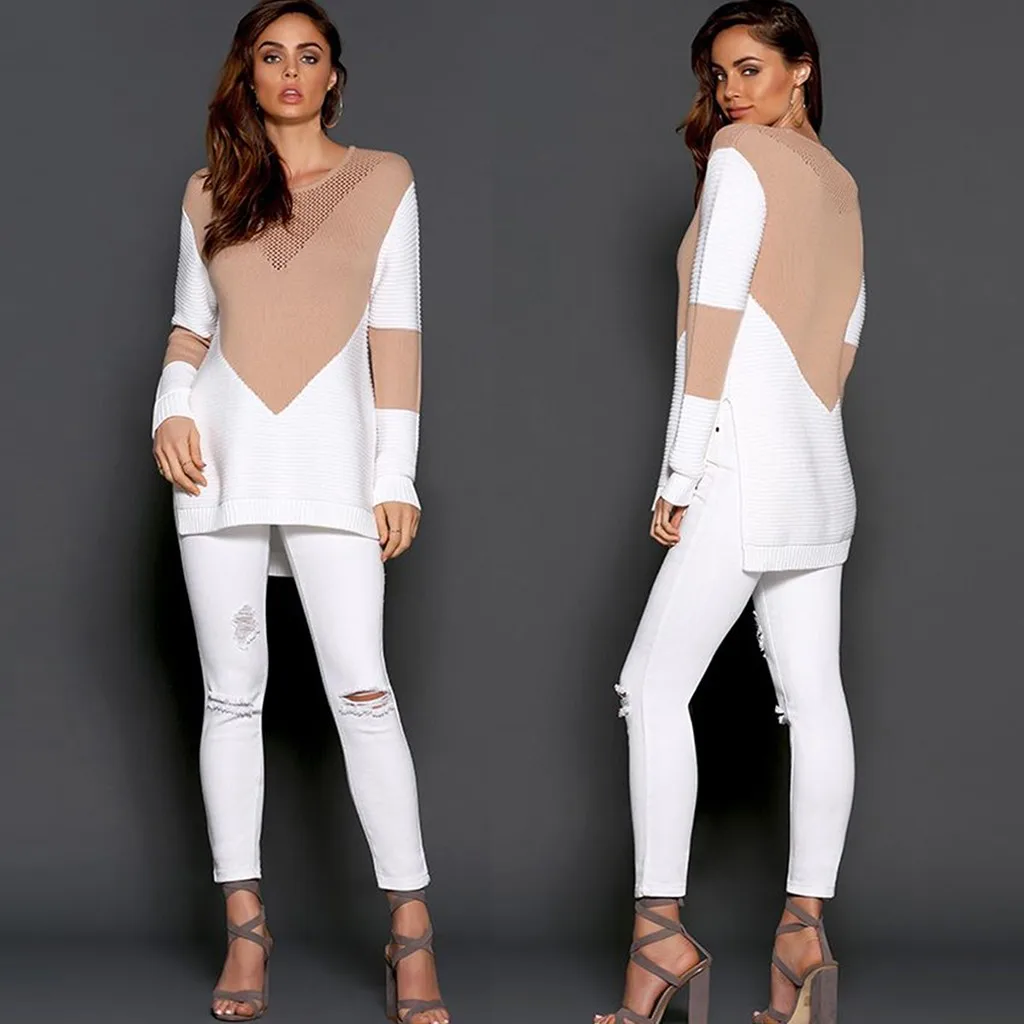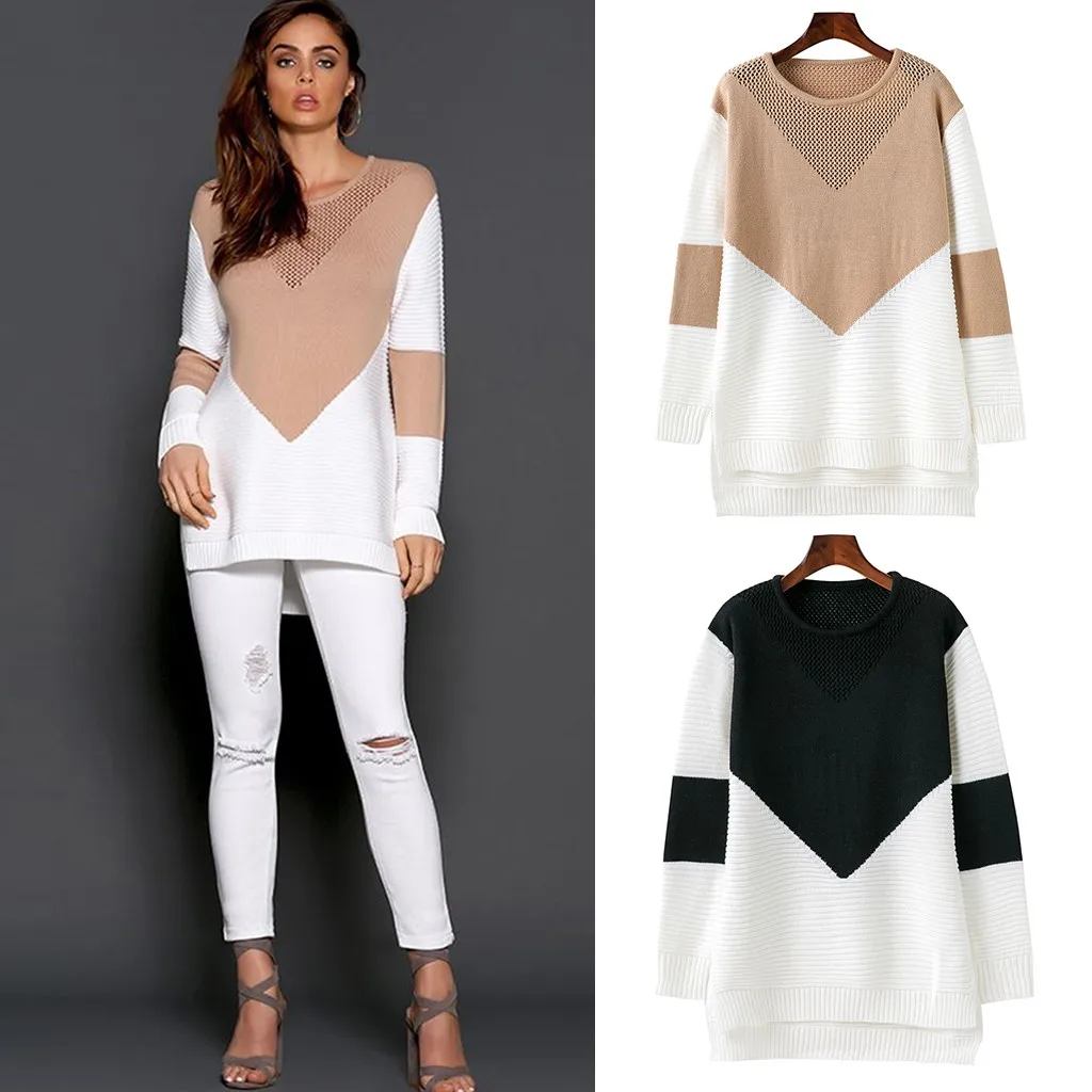 Women's Fashion Long Sleeve Colorblock Hollow Knitted Sweater Wrap Pullover