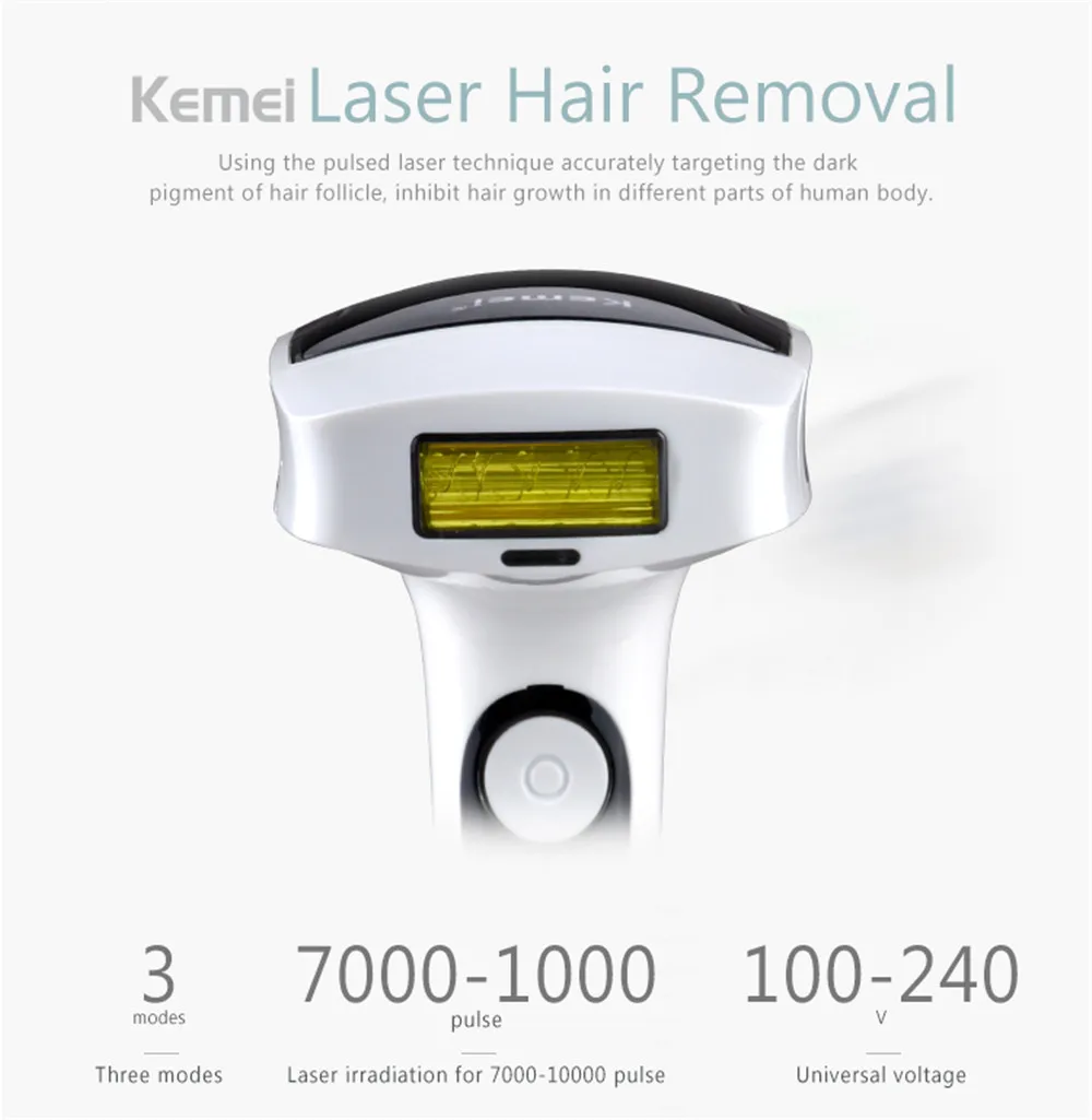 Продукт: фотоновое устройство для удаления волос Модель: KM-6812 Вес (включая упаковку): 832 г Вход Напряжение: AC 100-240 V 50/60Hz 0.8A Эпиляция Flash Pluse: 7000-10000 Потребляемая мощность: 3 Вт Адаптер Стандартный: ЕС