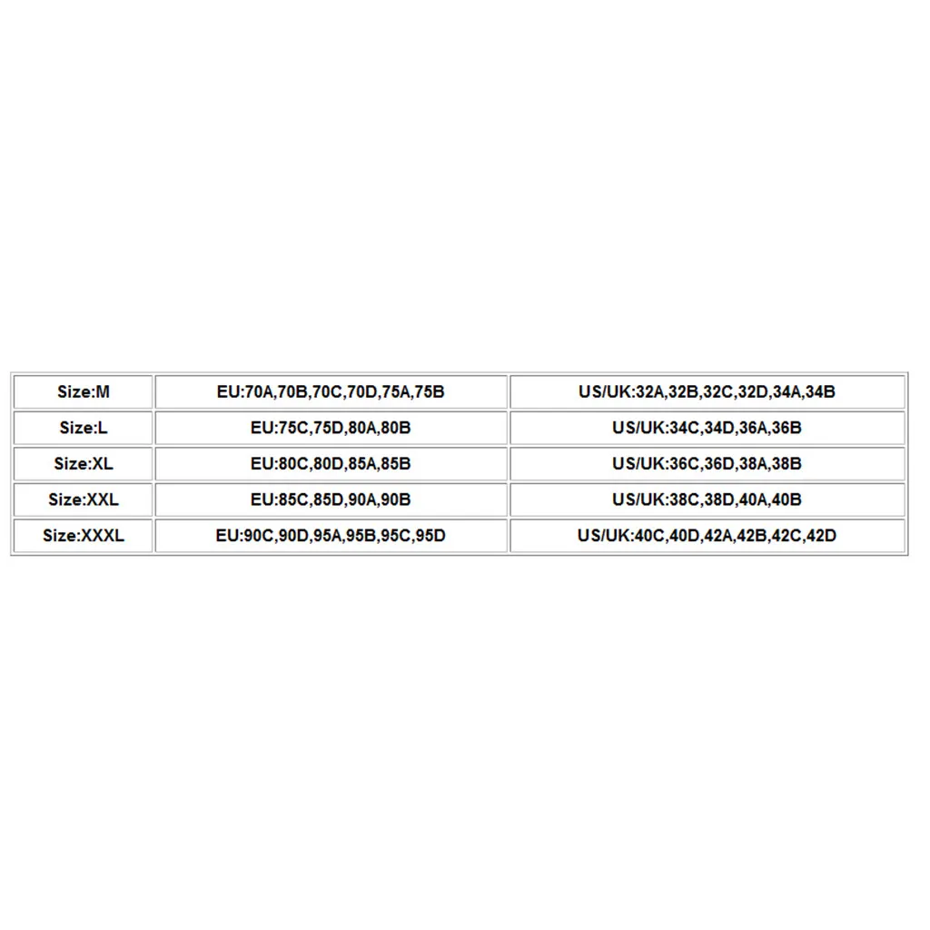 Размеры ЕС US/UK М 70A,70B,70C,70D,75A,75B 32A,32B,32C,32D,34A,34B L 75C,75D,80A,80B 34C,34D,36A,36B XL 80C,80D,85A,85B 36C,36D,38A,38B XXL 85C,85D,90A,90B 38C,38D,40A,40B XХХL 90C,90D,95A,95B,95C,95D 40C,40D,42A,42B,42C,42D