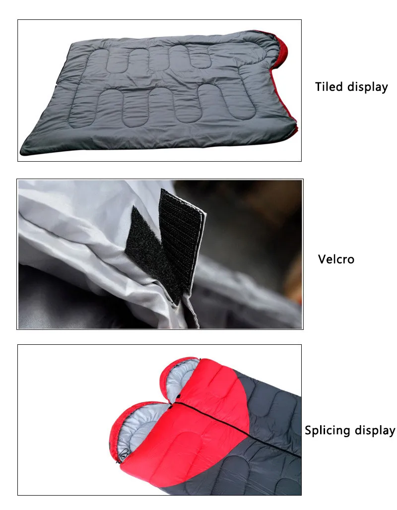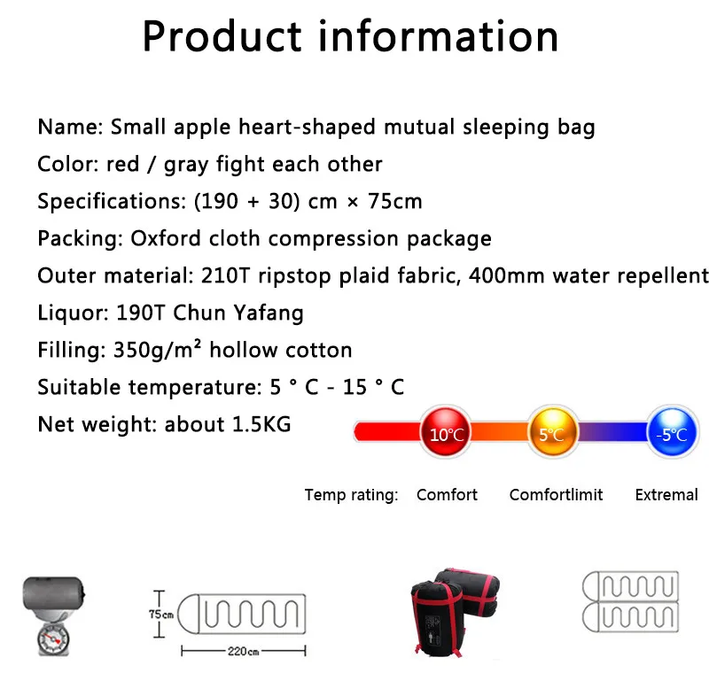 На картинке есть пара спальных мешков, сшитых вместе, вы можете купить один, вы также можете купить пару Информация о продукте Название: Маленький спальный мешок в форме сердца с яблоком Цвет: красный/серый сражаются друг с другом Характеристики: (190 + 30) см × 75 см Упаковка: ткань Оксфорд компрессионная упаковка Внешний материал: 210T Рипстоп клетчатая ткань, 400 мм водоотталкивающий Ликер: 190T Chun Yafang Наполнитель: 350 г/м2 полый хлопок Подходящая температура: 5 ° C - 15 ° C (в зависимости от окружающей среды и личной адаптации) Вес нетто: около 1,5 кг