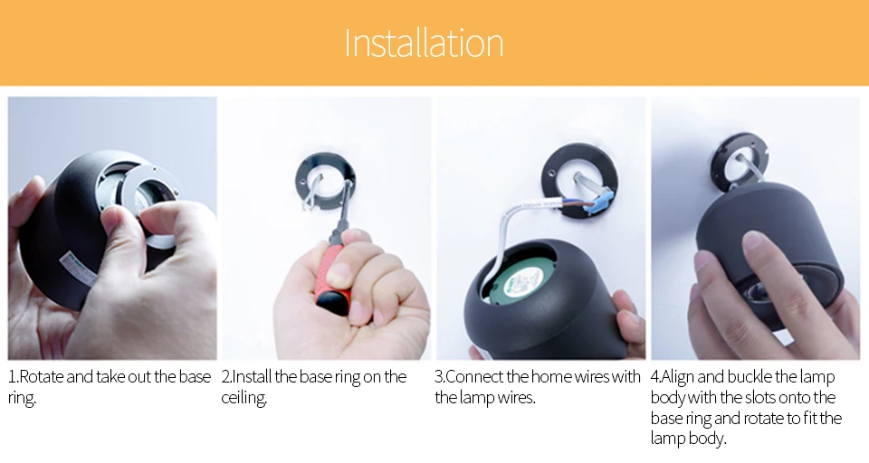Установка: 1. Закрепите опорное кольцо с помощью винтов, где вы защищены. 2. Подключите провода 3. Ввинтите корпус лампы в нижнее кольцо 4. Установлен