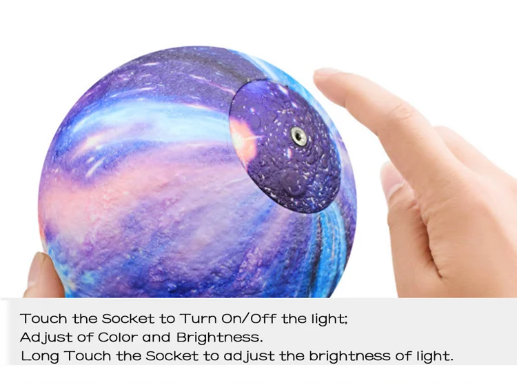 Длительное освещение. Полнозарядная Лунная лампа может работать до 4-20 часов (зависит от яркости), и это занимает около 3 часов для полной зарядки лампы. Лунная лампа с usb-зарядным устройством, вы можете легко зарядить эту лампу любыми usb-штекерами или банками питания.