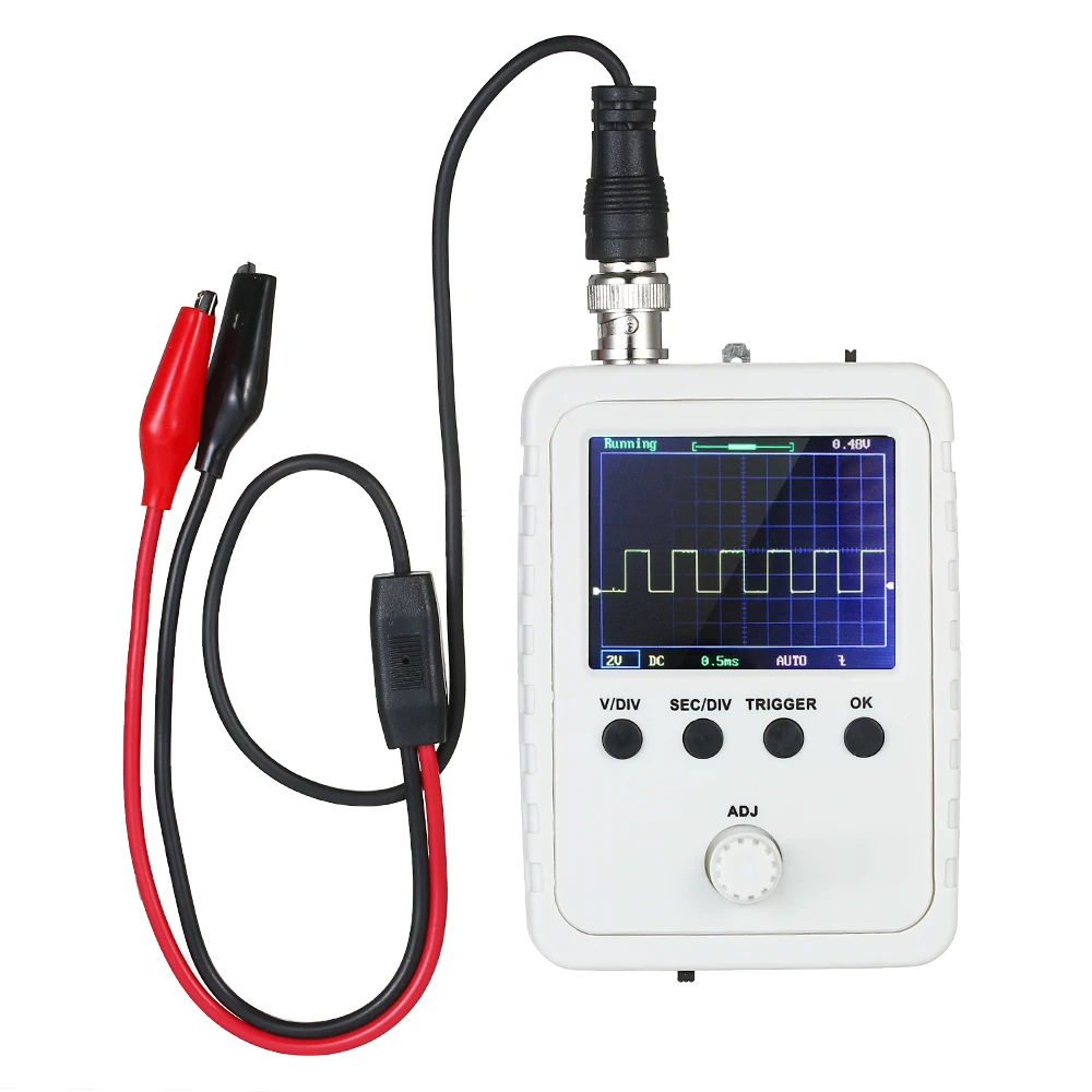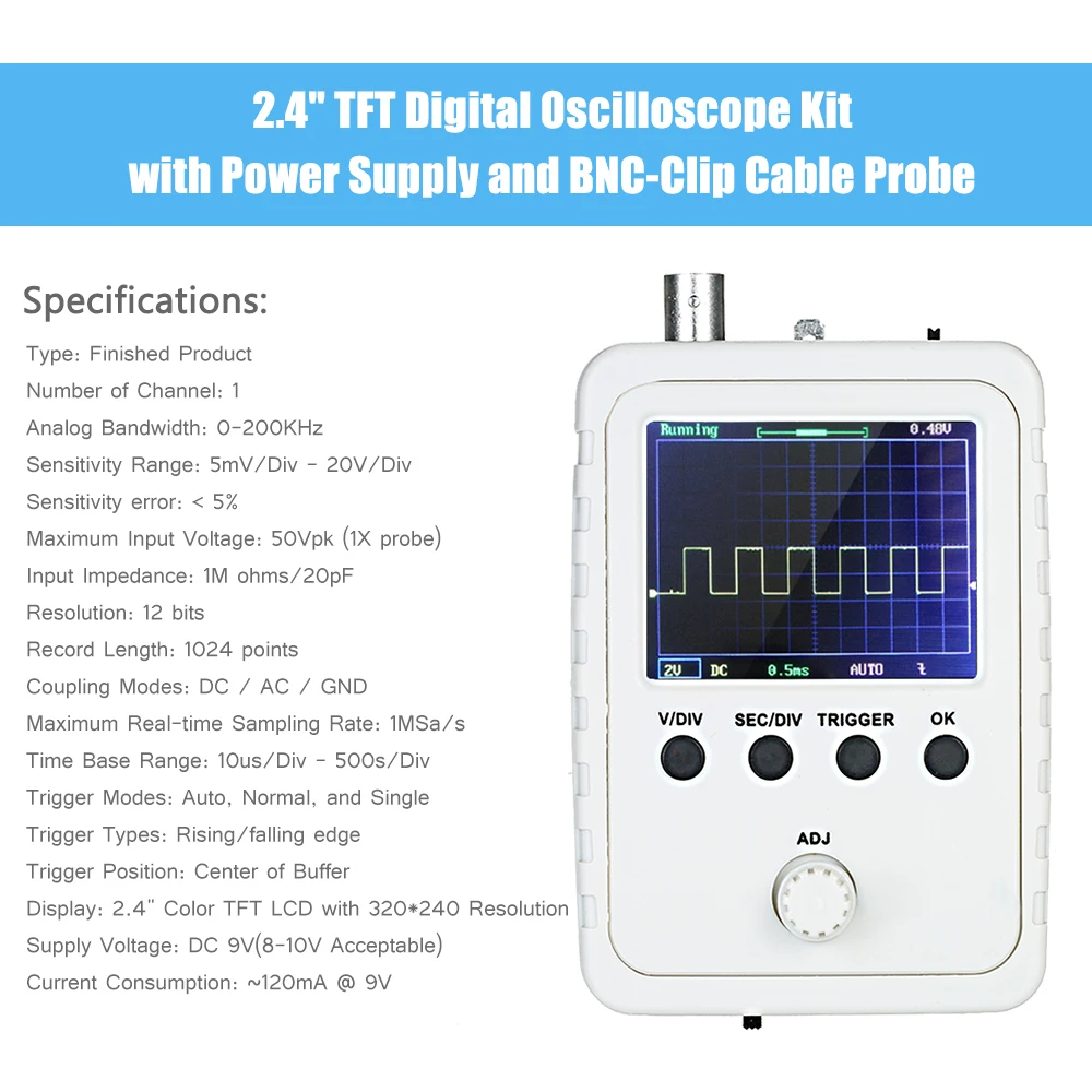 Этот цифровой осциллограф имеет аналогичную полосу пропускания DSO138, но содержит значительные улучшения в конструкции, механизме и работе. Он отличается высокой чувствительностью, светильник и удобный для переноски размер, 2,4-дюймовый TFT экран и защитный чехол. Он может отображать параметры формы волны, такие как частота, период, ширина импульса, коэффициент нагрузки, Макс./мин./AVG./пиковые/виртуальные значения.