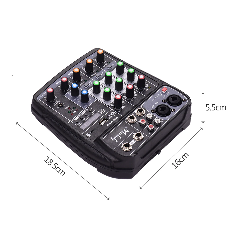 Компактный размер 4-канальный микшерный пульт с звуковая карта, подходит для дома записи музыки, сетевого вещания, караоке, сетевого пения и т. д. Источник питания micro USB 5 в постоянного тока, может питаться от адаптера питания, банка питания или компьютера, очень удобно в использовании.