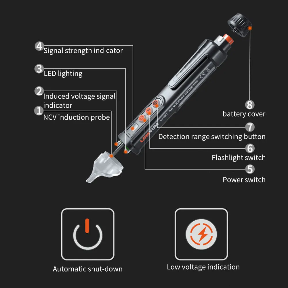 1. Индуктивный зонд NCV может обнаруживать напряжение без прикосновения к нему. Безопаснее использовать, чем традиционная электрическая ручка. При тестировании напряжения переменного тока он может автоматически обнаруживать горячую или нейтральную линию, разумно определить электрическое поле и определить напряжение. Это раздастся предупреждающий звуковой сигнал.