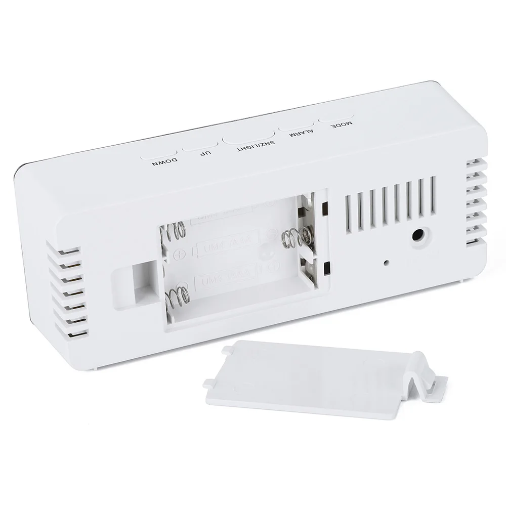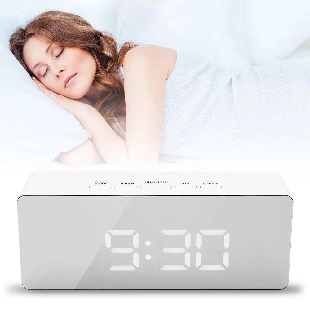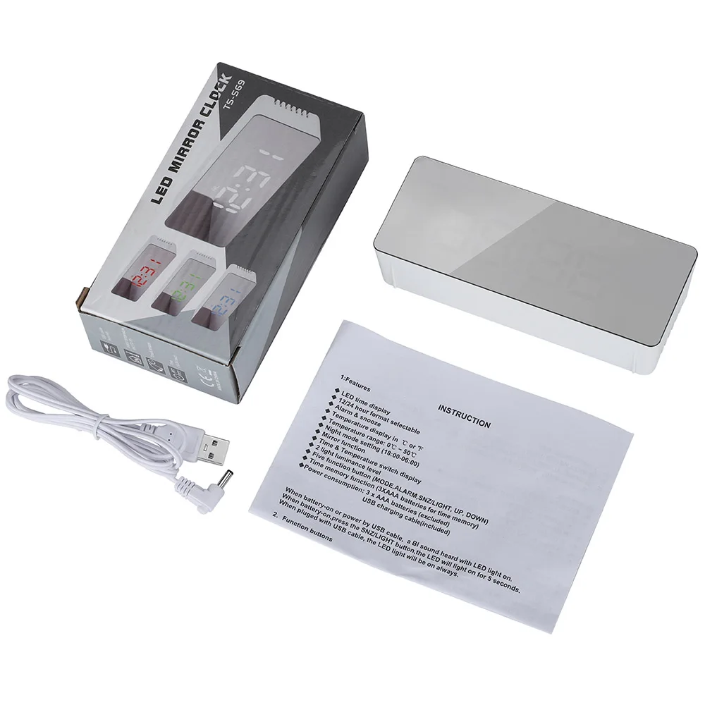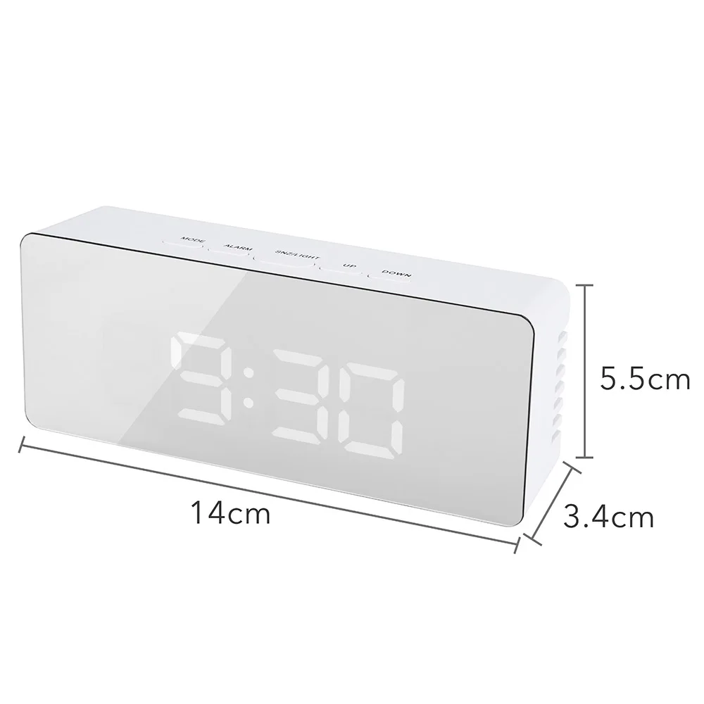 > Особенности 1. Большой светодиодный экран с мягкой белой подсветкой, два дисплея яркости для свободной регулировки, легко позволяя четко читать время издали даже ночью или в темноте. 2. Большая кнопка повтора на верхней части для повтора интервала времени от 5-60 минут, чтобы сделать себя полностью готовым к дню. 3. Умный ночной режим автоматически тускнеет светодиодный яркость подсветки в течение заданного времени (18:00-06:00), энергосбережение и экологичность. 4. Встроенный датчик температуры включает температурный режим с эффективным температурным диапазоном от 0 °C до 50 °C, оба °C/°F переключаются на выбор (может потребоваться некоторое время, чтобы отобразить соответственно температуру в помещении). 5. Простое управление с пятью функциональными кнопками, удобно устанавливать время, будильник, 12 или 24 часа выбора формата, температуры и т. д. 6. Легкий и портативный светодиодный зеркальный будильник для ежедневного напоминания времени, температурный монитор и даже приложение для макияжа, подходит для офиса, автомобиля и дома, гостиной, спальни и т. д. > Технические характеристики: Оболочки Материал: АБС-пластик Зеркало Материал: ПК Оболочки Цвет: белый Светодиодный цвет подсветки: Белый Формат времени: 12/24 часов Блок отображения температуры: °C/°F Диапазон температур: 0 °C ~ 50 °C Продолжительность интеллектуального ночного режима: 18:00-06:00 Функция памяти: поддержка (только при питании от 3 * батареек AAA) Питание: 3 * AAA батареи (батареи не включены) или usb зарядка (кабель входит в комплект) Размеры: приблиз. 14*5,5*3,4 см > Посылка в комплекте 1 * Светодиодный зеркальный будильник (батарейки в комплект не входят) 1 * USB кабель 1 * Руководство пользователя