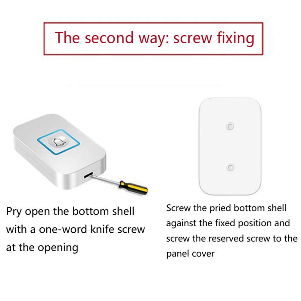 Посылка список: 1 * приемник дверного звонка, 1 * передатчик дверного звонока, 1 * наклейка, 1 * Клей Бумага, 2 * винты, 1 * Руководство пользователя