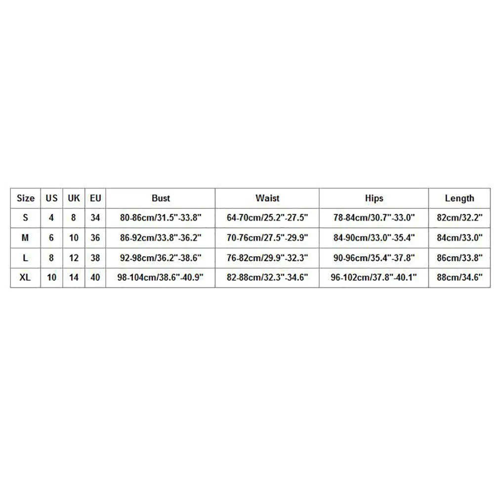 SizeUSUKEUBustWaistHipsLengthS483480-86cm/31.5"-33.8"64-70cm/25.2"-27.5"78-84cm/30.7"-33.0"82cm/32.2"M6103686-92cm/33.8"-36.2"70-76cm/27.5"-29.9"84-90cm/33.0"-35.4"84cm/33.0"L8123892-98cm/36.2"-38.6"76-82cm/29.9"-32.3"90-96cm/35.4"-37.8"86cm/33.8"XL10144098-104cm/38.6"-40.9"82-88cm/32.3"-34.6"96-102cm/37.8"-40.1"88cm/34.6"