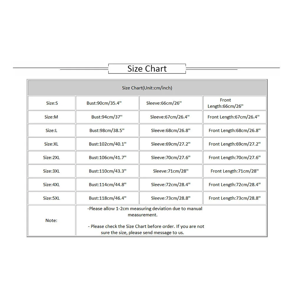 Таблица размеров (единица измерения: см/дюйм) Размеры: S Обхват груди: 90 см/35,4 дюйма Рукав: 66 см/26 дюймов Длина передней части: 66 см/26 дюймов Размеры: М Обхват груди: 94 см/37 дюймов Рукав: 67 см/26,4 дюйма Длина передней части: 67 см/26,4 дюйма Размеры: L Обхват груди: 98 см/38,5 дюйма Рукав: 68 см/26,8 дюйма Длина передней части: 68 см/26,8 дюйма Размеры: XL Обхват груди: 102 см/40,1 дюйма Рукав: 69 см/27,2 дюйма Длина спереди: 69 см/27,2 дюйма Размеры: 2XL Обхват груди: 106 см/41,7 дюйма Рукав: 70 см/27,6 дюйма Длина спереди: 70 см/27,6 дюйма Размеры: 3XL Обхват груди: 110 см/43,3 дюйма Рукав: 71 см/28 дюймов Длина передней части: 71 см/28 дюймов Размеры: 4XL Обхват груди: 114 см/44,8 дюйма Рукав: 72 см/28,4 дюйма Длина спереди: 72 см/28,4 дюйма Размеры: 5XL Обхват груди: 118 см/46,4 дюйма Рукав: 73 см/28,8 дюйма Длина передней части: 73 см/28,8 дюйма Примечание: -Возможно отклонение в 1-2 см, так как измерения выполнены вручную.