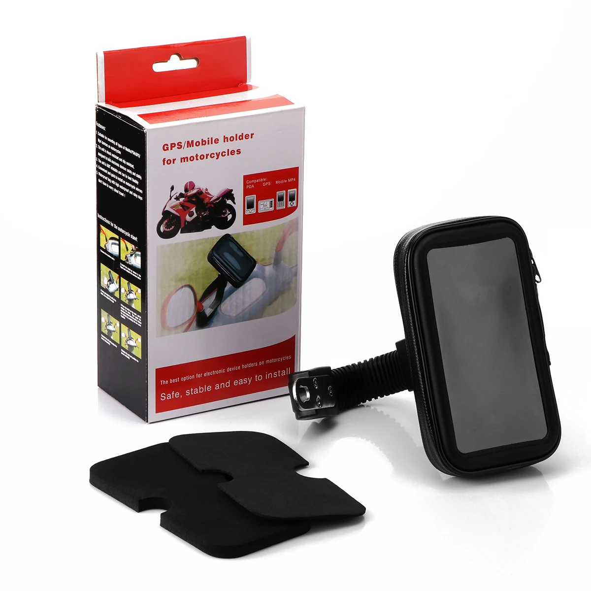 Держатель телефона имеет полностью регулируемый шарнир шаровой головки с системой блокировки для индивидуального портретного и ландшафтного вида. Конструкция для фиксации на болте зеркала заднего вида мотоциклов, диаметр которого составляет 10 мм.