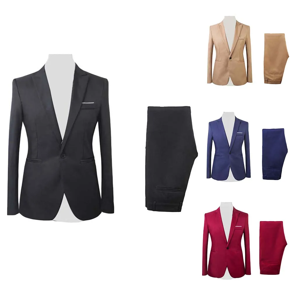 2Pcs/Set Men Formal Business Party Solid Color Long Sleeve Blazer Suit Pants