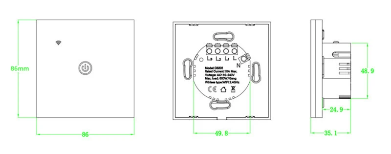 Вход напряжение: 100-240VAC 50/60Hz Сеть Wi-Fi Номинальная мощность: 600 Вт/комплект Потребляемая мощность в режиме ожидания: 0,5 W Размер: 86*86*35 мм Срок службы: 100000 раз Цвет корпуса: белый Рабочая температура: -20 ℃ ~ + 50 ℃ Пластиковый материал: АБС-пластик Степень защиты от огня: 94-V0