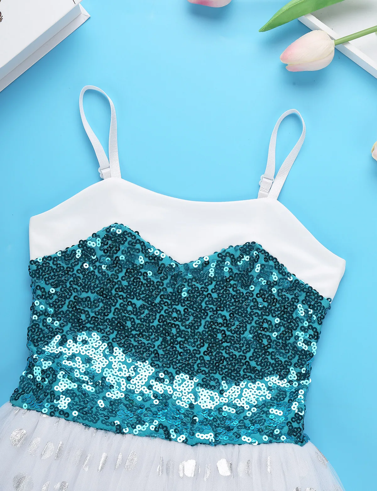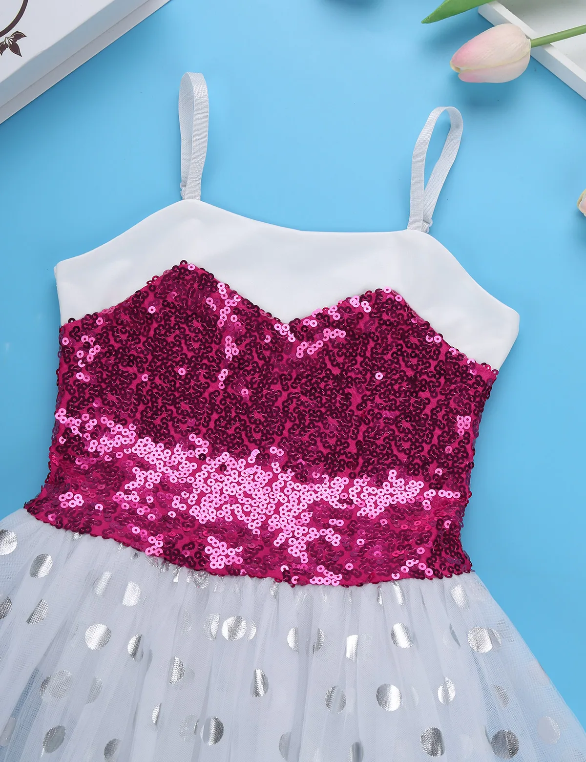 Балетное гимнастическое платье изготовлено из полиэстера, пайеток и сетчатого материала, ручная стирка.