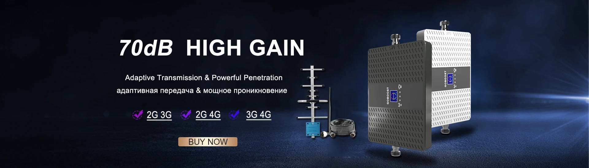 Мощная антенна достигает доступа к хорошему сигналу и доставляет его к бустеру.