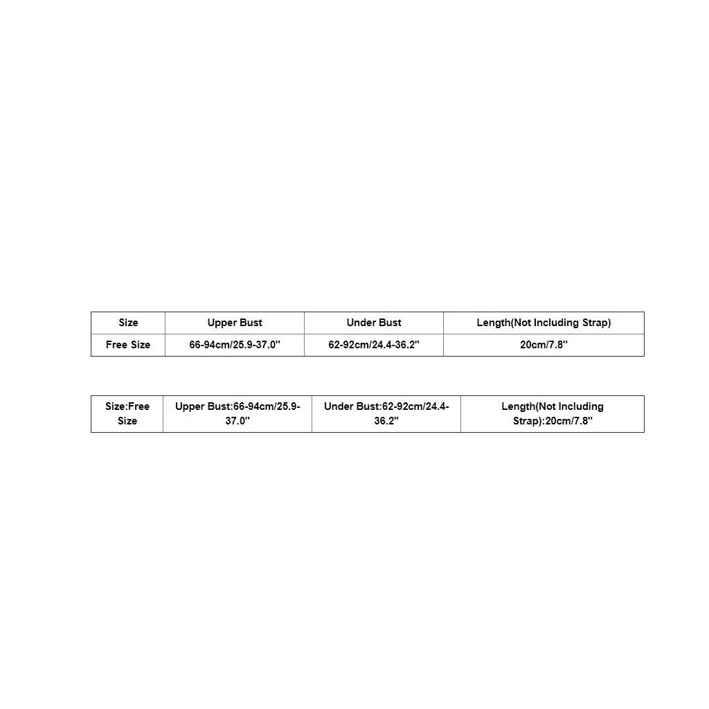 Размеры Верхний бюст Обхват под грудью Длина (без ремешка) Бесплатная Размеры 66-94 см/25,9-37,0'' 62-92 см/24,4-36,2'' 20 см/7,8''