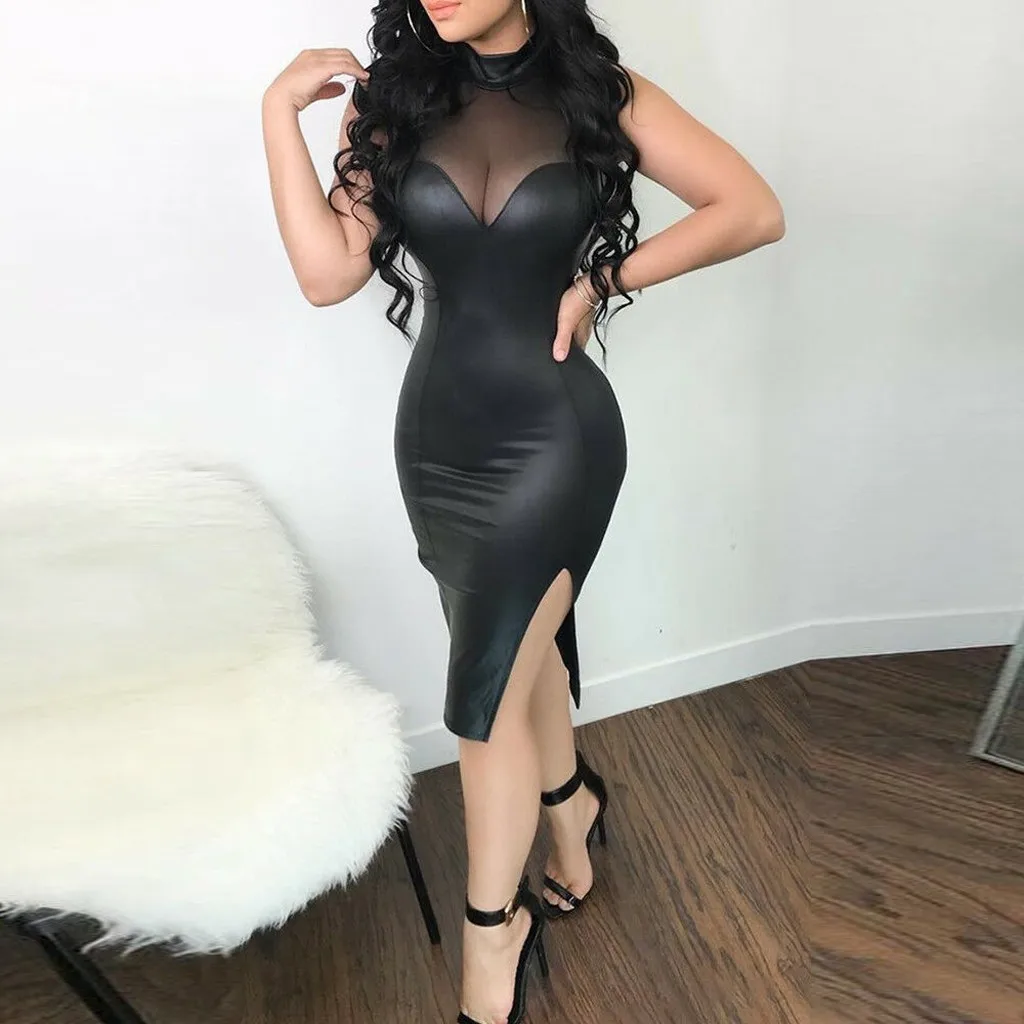 Модное женское тонкое сексуальное сшитое платье без рукавов из кожи