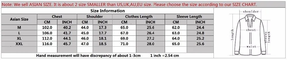 Примечание: Мы продаем Азиатские размеры. Это примерно на 2 размера меньше, чем размер США, Великобритании, Австралии, ЕС. Пожалуйста, выберите размер в соответствии с нашей таблицей размеров.Размеры информацияАзиатский РазмерыОбхват грудиСумка на плечоОдежда ДлинаРукав ДлинаСмДюймовСмДюймовСмДюймовСмДюймовМ102,040,244,017,365,025,662,024,4L106,041,745,017,767,026,463,024,8XL112,044,146,018,169,027,264,025,2XXL116,045,747,018,571,028,065,025,6При измерении вручную возможны расхождения в 1-3 см, 1 дюйм = 2,54 см