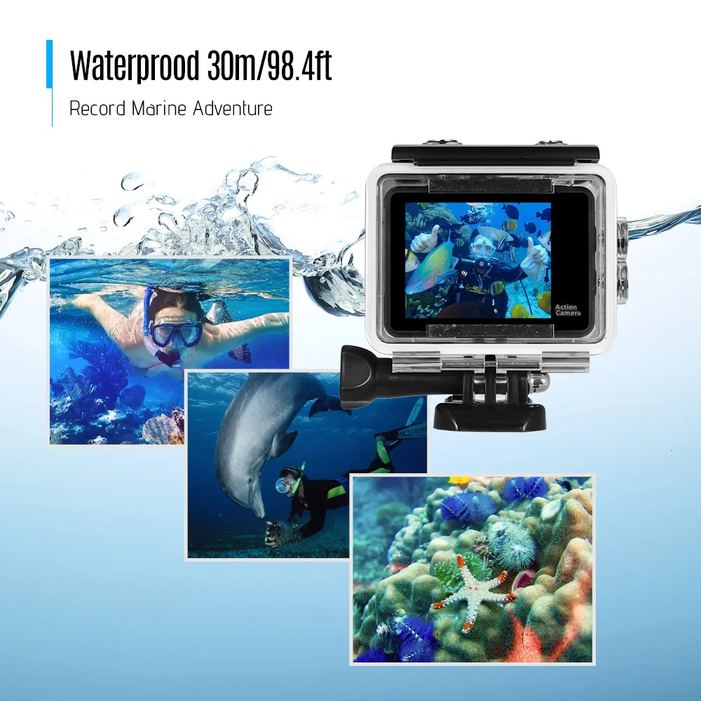 Поставляется с водонепроницаемым корпусом и водонепроницаемой глубиной до 30 метров, что позволяет использовать экшн-камеру для съемки замечательных фотографий под водой, идеально подходит для дайвинга, серфинга, катания на лыжах и других видов спорта на открытом воздухе.