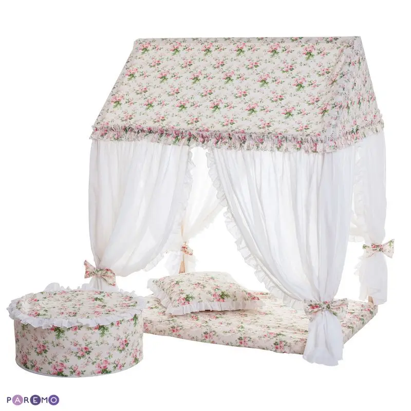 - Комплектация игрового набора: деревянный каркас, чехол в форме домика, 4 банта на липучках, мат в основании, подушка и детский пуфик. Все текстильные элементы съемные для удобства стирки.