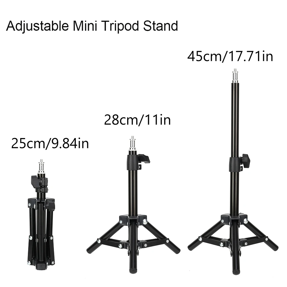 Регулируемый мини-штатив и гибкая шариковая головка:Поставляется с мини-металлической подставкой для штатива, регулируемая высота 28-45 см/11-17, 7 дюймов, что позволяет вам стабильно использовать светодиодный светильник-кольцо на столешнице; И вращающаяся шариковая головка позволяет свободно регулировать светильник, наклоняясь по углам.