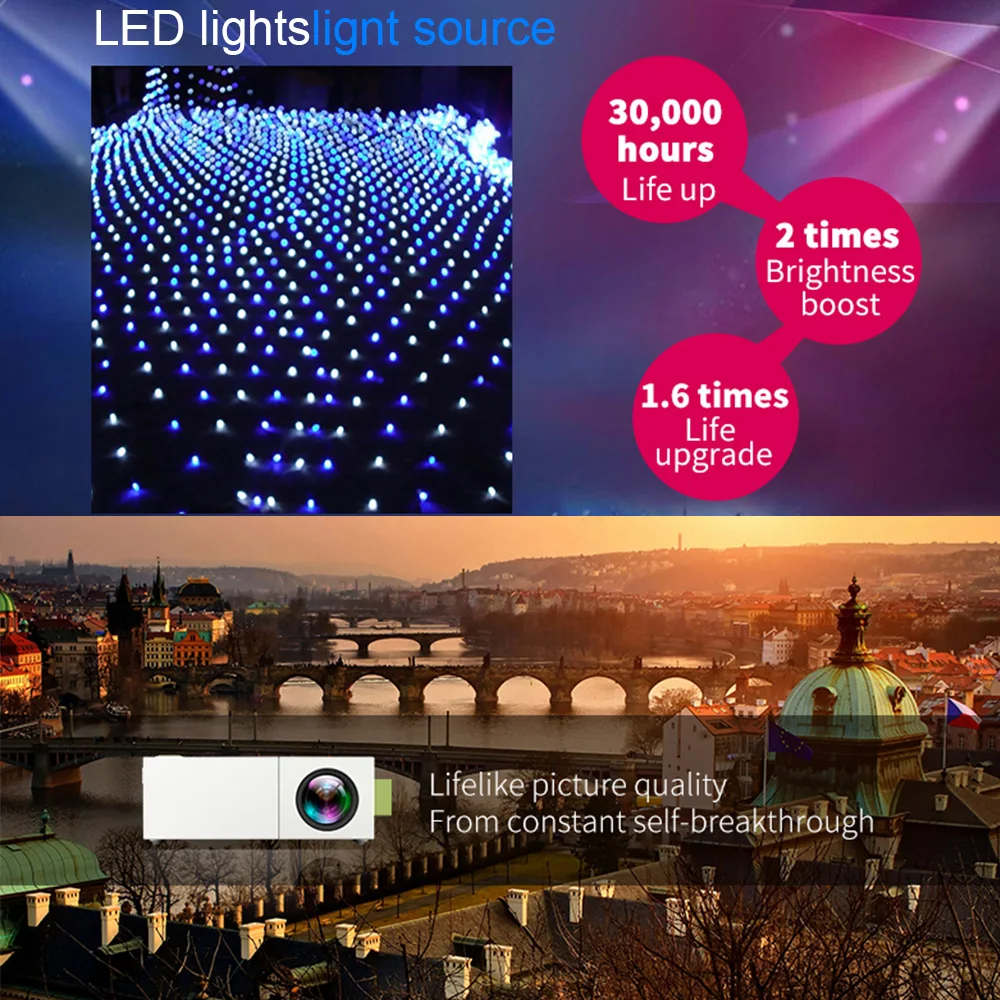 -Мультимедиа: проектор Совместим с tv box, ПК, ноутбуками, планшетами, dvd-плеером, sd-картой, USB флеш-накопителем, видеоиграми, медиаплеерами (музыка, картинки, видео, TXT), смартфоны (Примечания: беспроводной HDMI донгл не включен).