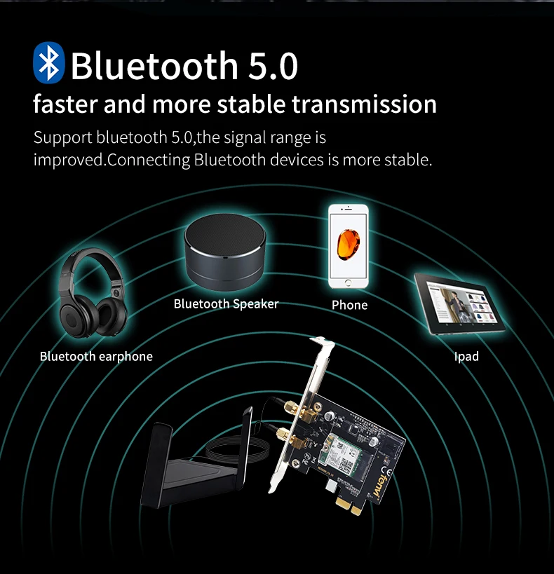 BT5.0 технологии. Поддержка соединение с Bluetooth гарнитура, Bluetooth стерео гарнитура, Bluetooth клавиатура, синезубая мышь и другие для большего удобства и потребности клиента. Эффективный WI-FI выбросов вставьте ее в настольном компьютере, чтобы построить беспроводной WI-FI сигналов. Мобильные телефоны, ноутбуки, планшеты, шт. имеют возможность подключения.