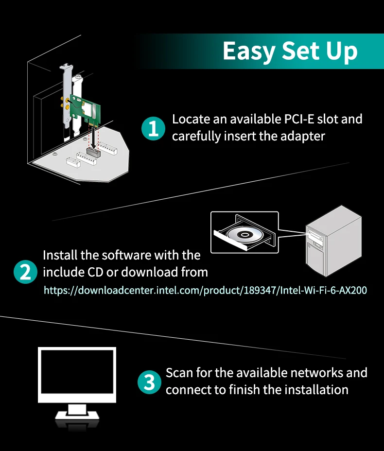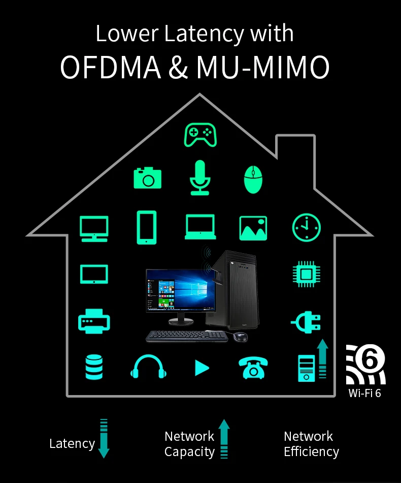 Мгновенный 802.11ac/ax Wi-Fi обновление для настольному компьютеру: не более грязных кабелей Ethernet не требуется; Следующего поколения 802.11ac/ax микросхем для супер-быстрых соединений до 2400 Мбит/с; Выбор двухдиапазонный 2,4 ГГц и 5 ГГц операции с обратная совместимость со всеми существующими устройства; Высокомощный дизайн для большего покрытия сигнала; Специально разработанные радиатор обеспечивает стабильный и надежный непрерывной работы.