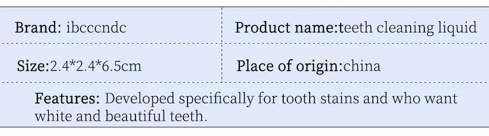 Примечание: Перед использованием, пожалуйста, очистите рот теплой водой, затем Используйте ватный тампон, чтобы окунуть необходимое количество продукта, протрите зубы поверхности многократно перед зеркалом. Промойте теплой водой до тех пор, пока налет не протерт. Инструкции по уходу за изделием 1. При удалении пятен, пожалуйста, протрите аккуратно, чтобы не повредить десны и слизистую полость рта; 2. Правильно намочите ватный тампон, когда он пропитан, убедитесь, что он не слишком влажный; 3. Для протирания каждого зуба требуется около 1 мин; 4. Если пятна не могут быть удалены полностью, пожалуйста, используйте снова после недели; 5. Дети до 13 лет не должны использовать его. Не пытайтесь глотать.
