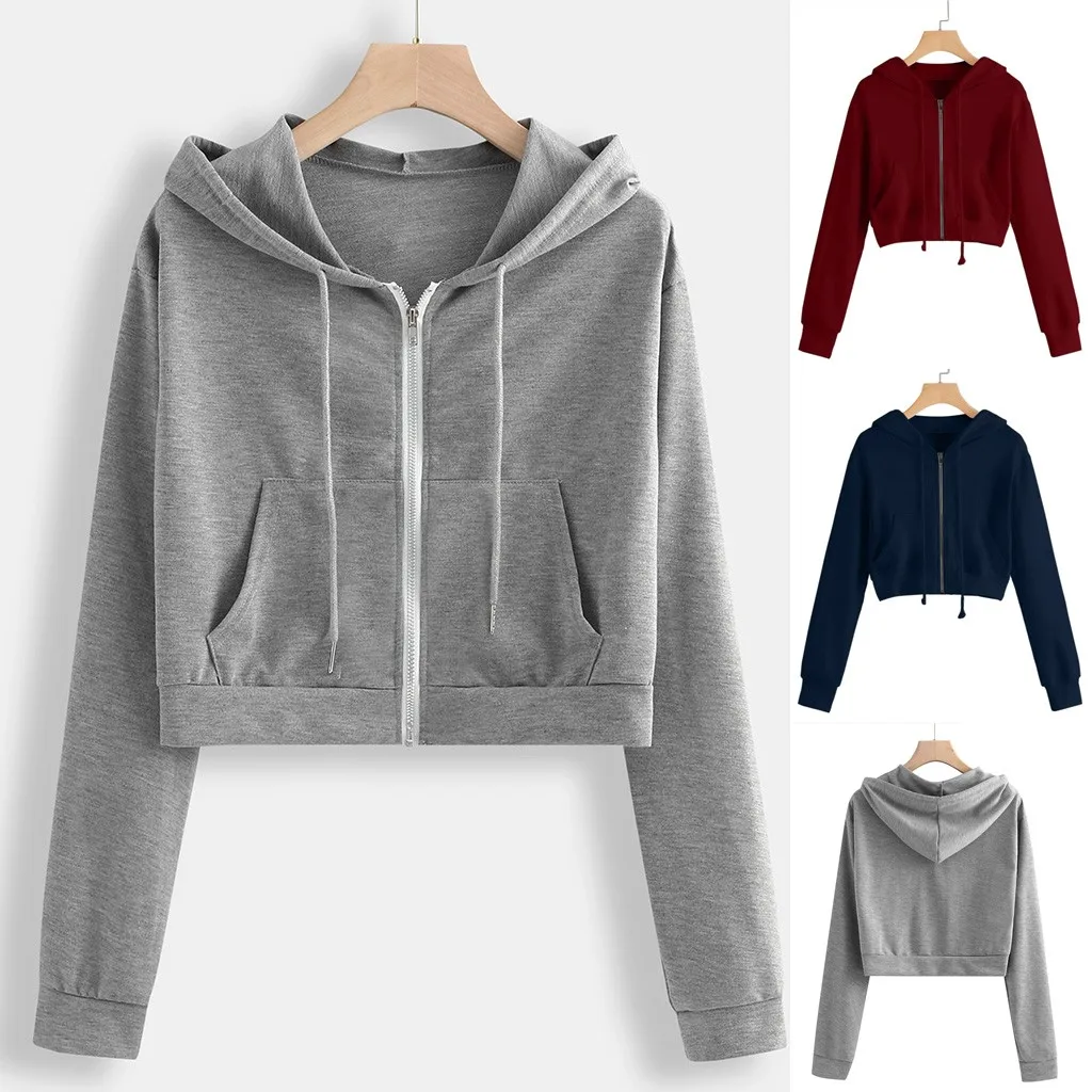 Женская Повседневная Однотонная рубашка с длинным рукавом на молнии и карманом, толстовка с капюшоном, топы