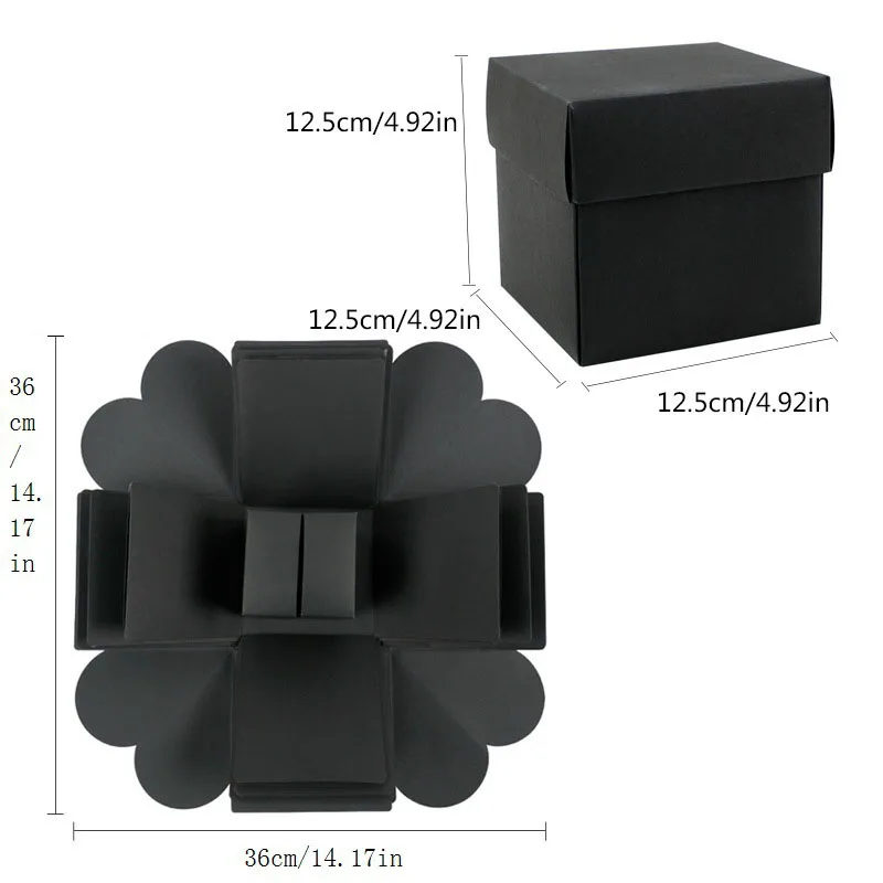 Характеристика продукта 1. Выглядит как Подарочная коробка и когда ее открыть, все стороны падают, чтобы показать большую многослойную карту. 2. Простой в использовании, просто согласно вашим собственным идеям, чтобы сделать его своими руками. 3. Небольшая Подарочная коробка внутри, вы можете положить в нее кольцо, часы, ожерелье или другие товары в качестве сюрприза. 4. Встроенный более 20 видов частей, чтобы вы могли писать и записывать вещи между вами. 5. Идеальный подарок для помолвки, свадьбы, юбилея, дня рождения, Дня Святого Валентина или даже для записи роста Вашего ребенка. Описание: Тип товара: коробка-сюрприз Размер складывания: 12.5x12.5см (4.92X4.92in) Расширенный размер: 36x36 см Цвет: черный (случайный цвет ленты) Подходит для: подарок Материал: бумага Инструкции: вам нужно сделать Diy, чтобы вставить картинки и написать слова Комплект поставки: 1 * DIY Фотоальбом (просто пустая бумага, за исключением фотографий или наклеек)