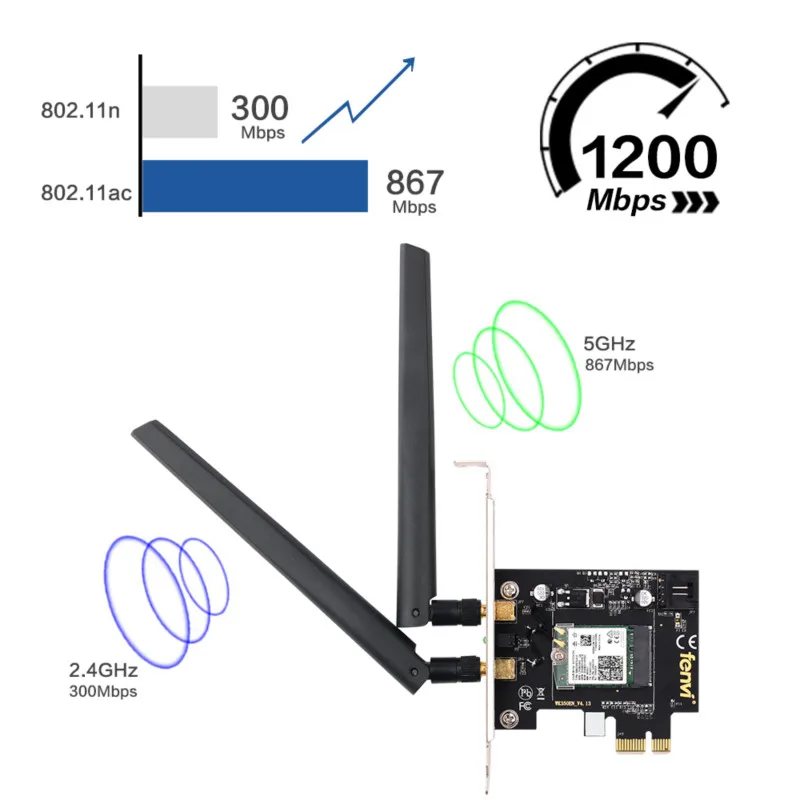 Бренд: Fenvi Модель: FV-8265AC (см. Подробную информацию) Chipest: для Intel 8265AC Chipest Поддержка MU-MIMO Стандарт IEEE: 802.11ac С Blutetooth 4,2 Двухдиапазонный 2,4-300 Мбит/с/5Ghz-867Mbps