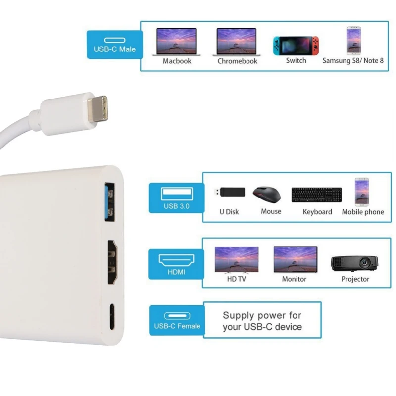 1. Поддержка 4K x 2K HDMI --- портативный концентратор адаптера HDMI поддерживает разрешение видео до 3840X2160P,30 Гц с совместимостью большинства мониторов, проекторов, HDTV и других устройств с портом HDMI