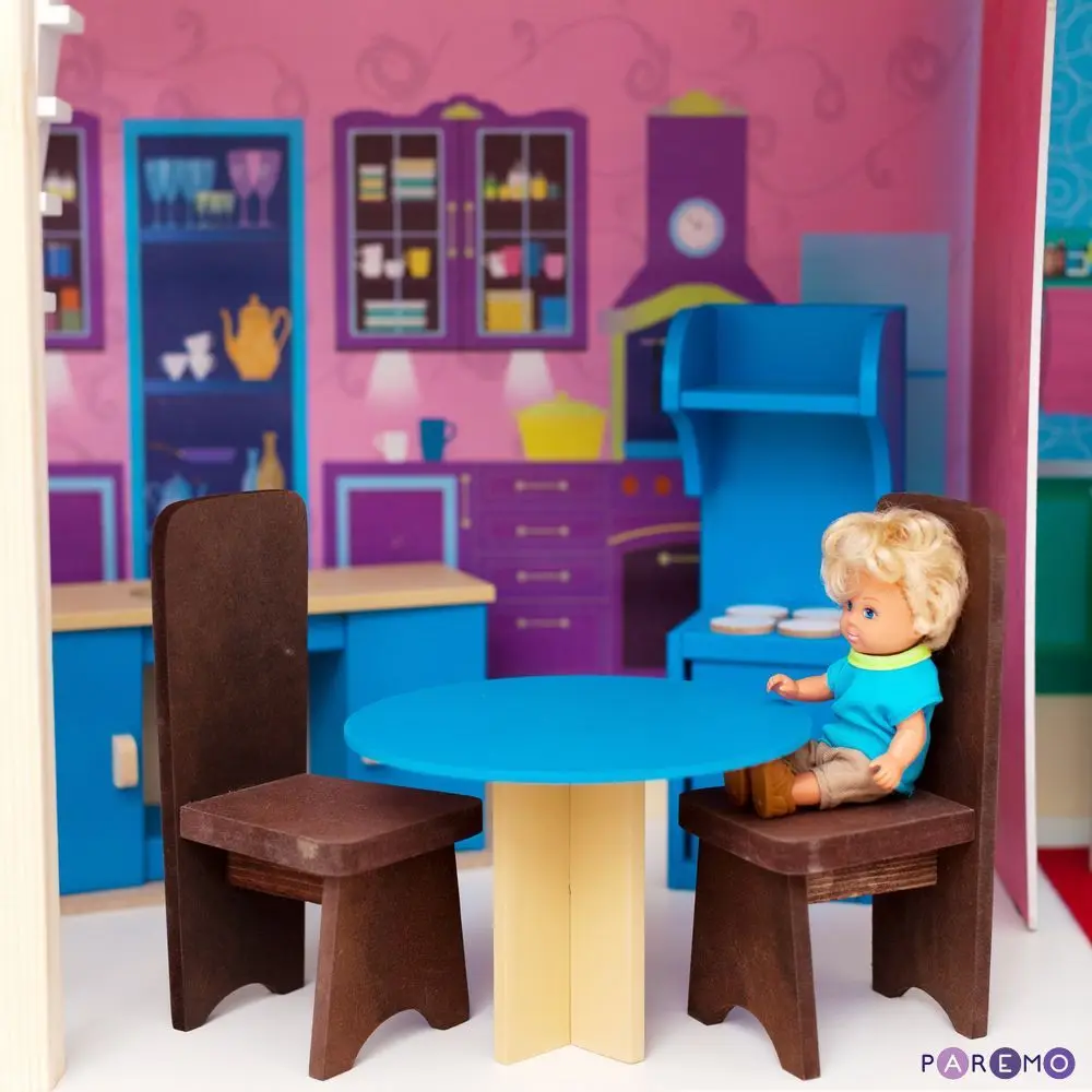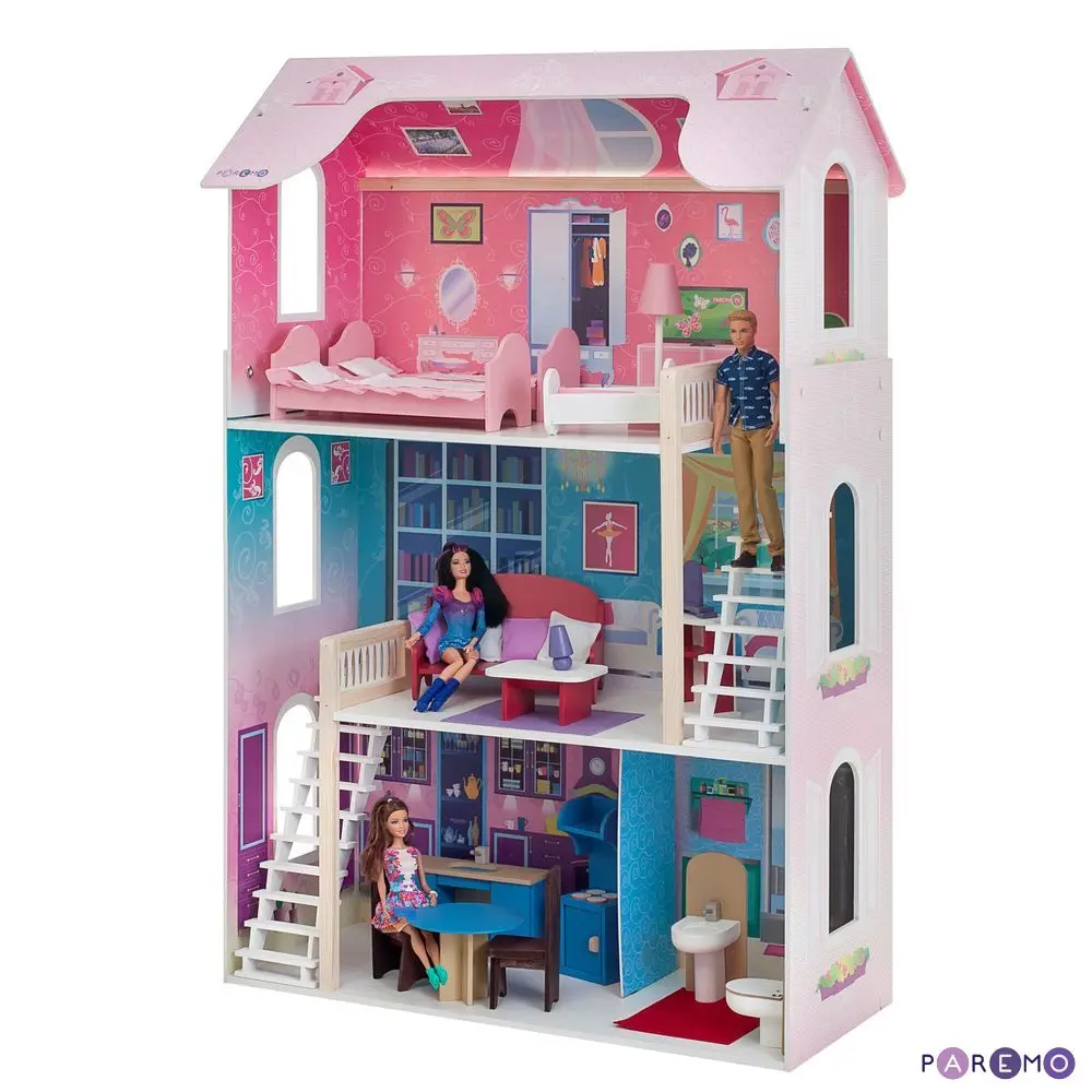 - Особенность: домик, выполненный в классическом для девичьей игрушки розовом цвете. Игрушку отличает яркий принт по дереву и использование премиального материала флок. Модификация: трехэтажный, четырехкомнатный, с 2-мя лестницами. Сделано в России!
