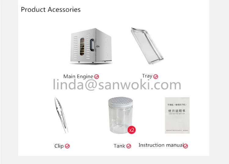 Модель: SA-27 Напряжение: 220 В 50 Гц или 110 В 60 Гц Мощность: 1000W Материал машины: пищевая нержавеющая сталь Количество слоев: 12 слоев Размер машины: 465*400*430 мм Расстояние между слоями: 30 мм Размер слоя: 385*285 мм Диапазон времени: 0-24 ч Диапазон температур: 30-90 ℃ Вес нетто: 11,5 кг Функция введение 1. Быстрая и легкая сушка фруктов и овощей, а также мясных продуктов; 2. Могут быть Сушеные яблоки, сушеные бананы, сушеные овощи, говяжьи ягоды и другие здоровые и натуральные ароматы пищи; 3, система сушки циркуляции горячего воздуха, может быстрее сушить еду; 4. Конструкция контроля температуры, может устанавливать различные температуры горячего воздуха в соответствии с различными продуктами питания. 5. Высококачественная конструкция из нержавеющей стали! 12-полочный супер большой торгового потенциала! Этот продукт используется для обезвоживания свежей пищи, мяса и других продуктов, то есть для испарения воды в пище, так что свежая пища становится сухой и легко хранить, но это не влияет на питание. Могут быть сухофрукты, сушеное мясо, мясо, макароны, колбасные изделия, сушеные овощи, сушеные травы, закуски для домашних животных, сушеный чай, сушеная Влага и так далее. Делайте это самостоятельно, будьте здоровее и ешьте более уверенным. Подчеркивайте темперамент и получайте удовольствие. Любимая детская, еда должна быть, мм красота, компаньон для домашних животных!