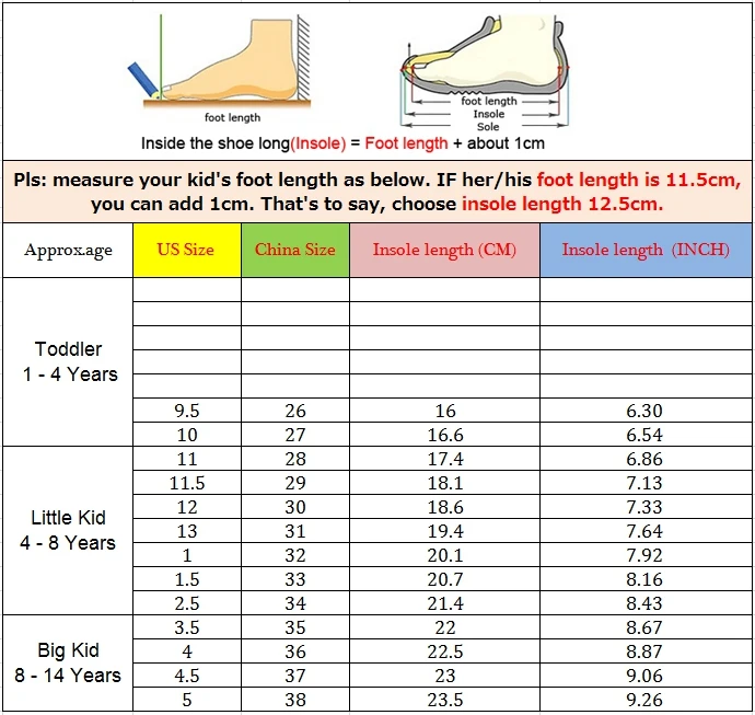 Поскольку все размеры детской обуви отличаются, при заказе детской обуви вы должны соответствовать нашим размерам и внутренней длине.